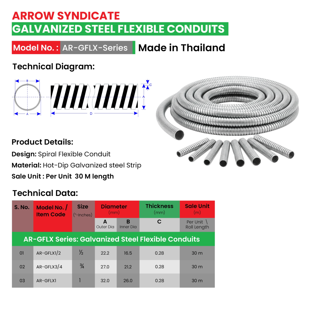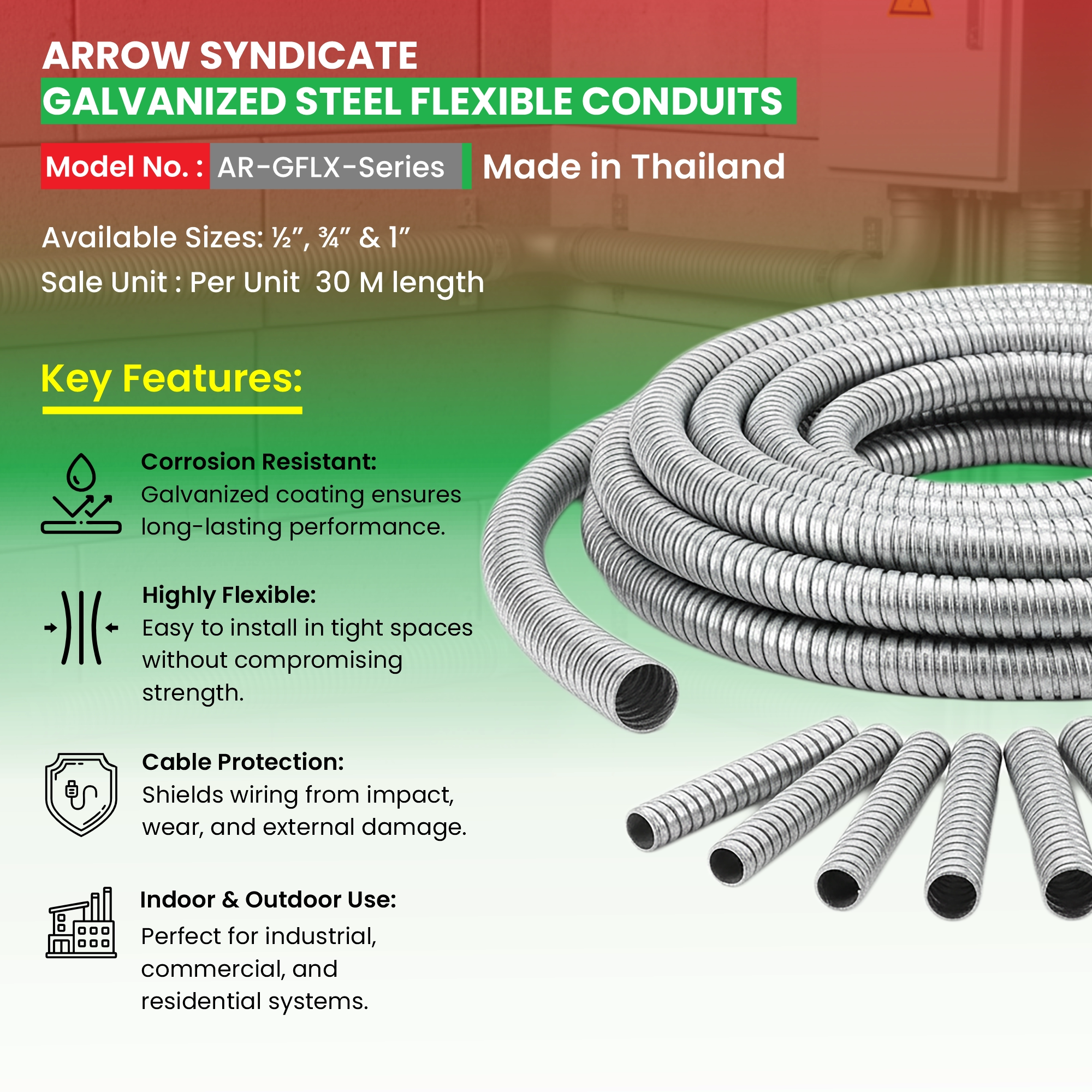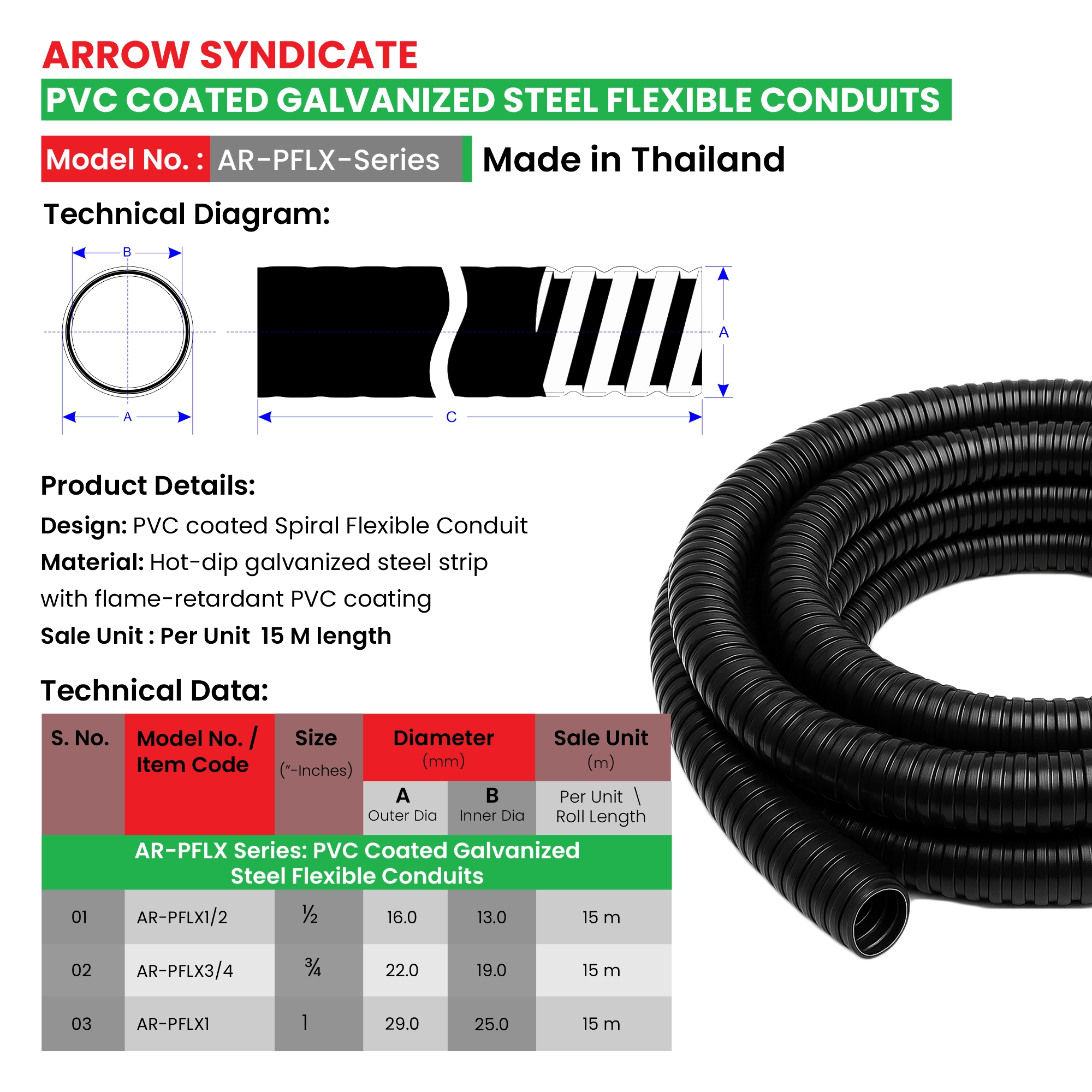 The ARROW Steel FLX Hoses (PVC Coated Steel Flexible Conduit) are high quality grade conduits made with a hot-dip galvanized steel core and high-quality PVC coating. These conduits are engineered to provide outstanding flexibility, strength and resistance to mechanical stress, moisture and corrosion. Suitable for industrial, commercial and residential applications they offer reliable protection for electrical cable from impact, abrasion and harsh environments. The ARROW Steel FLX Hoses (PVC Coated Steel Flexible Conduit) are the ultimate combination of strength, flexibility and safety. With compliance to international standards and proven use in critical projects worldwide.