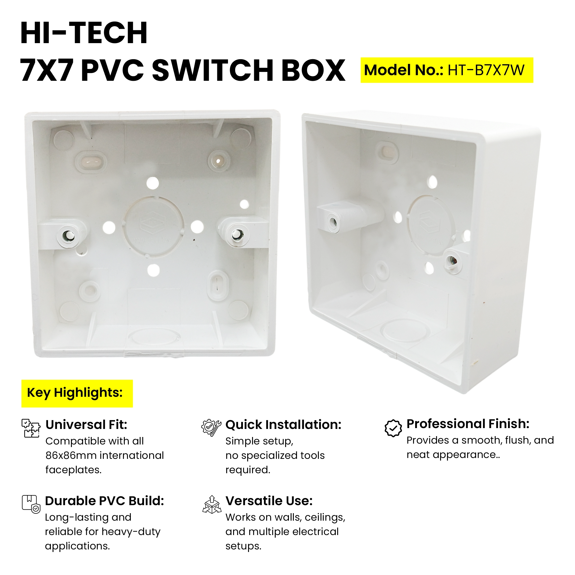 HI-TECH 7×7 Box is professionally engineered for a smooth and easy process to convert and adjust your installation into international standard 86x86mm faceplates. It fits all the time and is engineered to be durable and easy to use, hence, suitable for residential, commercial, and industrial installations.
