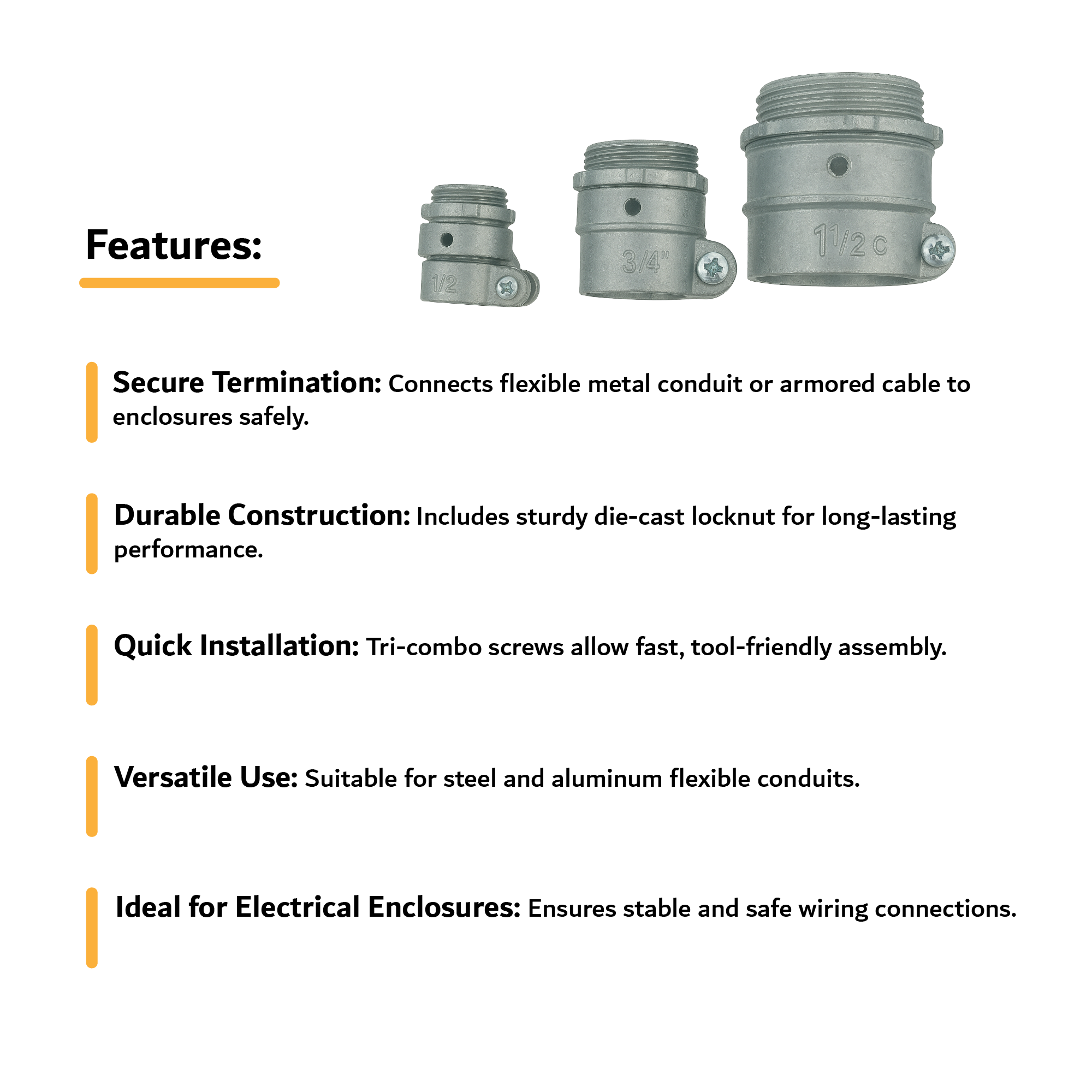 EMT Flexible Connectors are important components for securely and safely terminating armored cable (AC) or flexible metal conduit (FMC) into electrical enclosures. These connectors are built with a sturdy die-cast locknut and tri-combo screws, guaranteeing a tight fit while preserving grounding integrity, and are intended for fast and dependable installation. EMT Flexible Connectors offer a useful solution for flexible wiring pathways in commercial, industrial, and residential installations and are compatible with both steel and aluminium tubes.