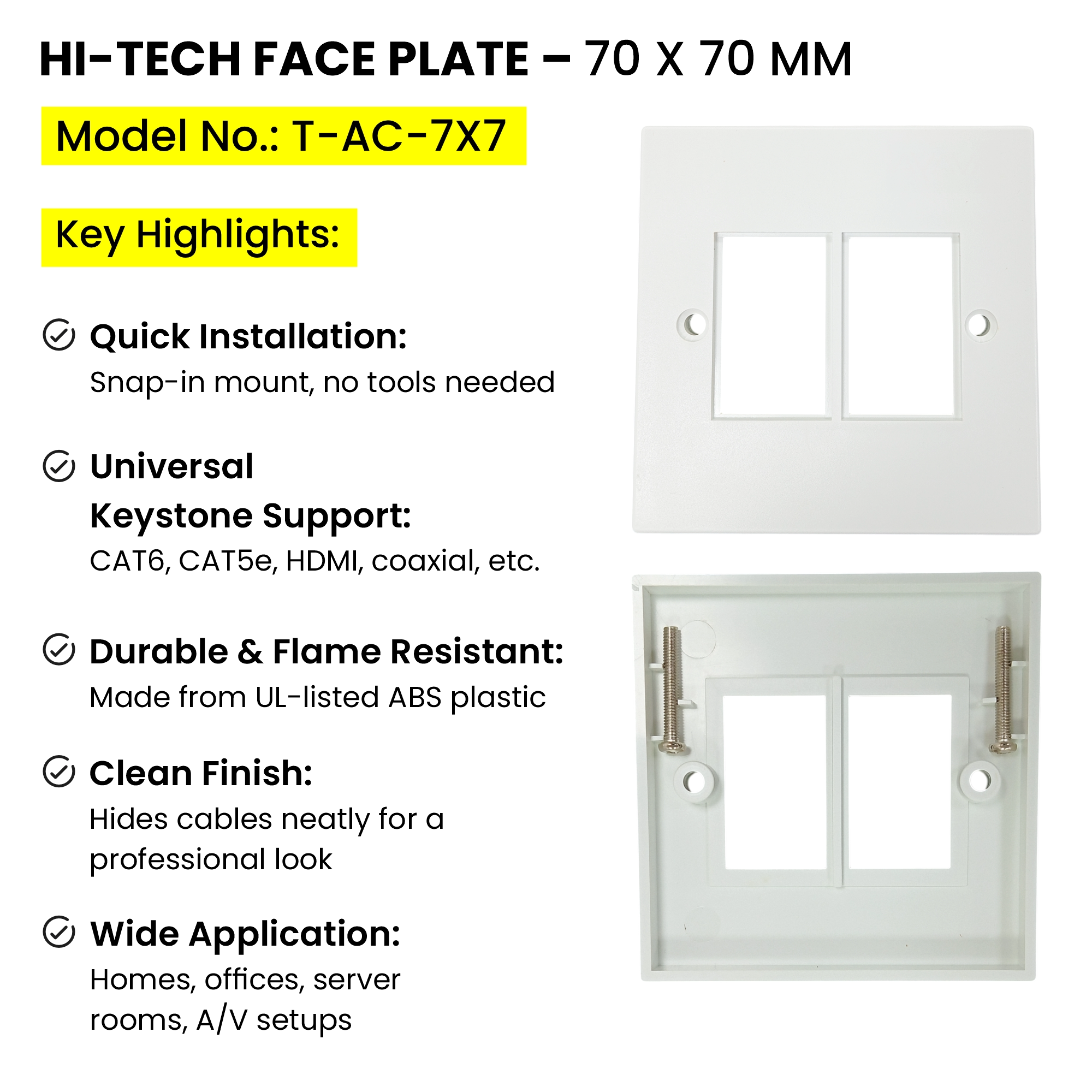 The HI-TECH face plate provides a neat, tidy finish to your walls so that your network installation not only works well but looks good as well. It is the intelligent solution for homes, offices, server rooms and data centers. A quality, nice-looking product that allows you to easily manage your network cables. You don’t need to be a tech expert to install it. Just snap it in place, connect your Keystone jack, and you’re done.
