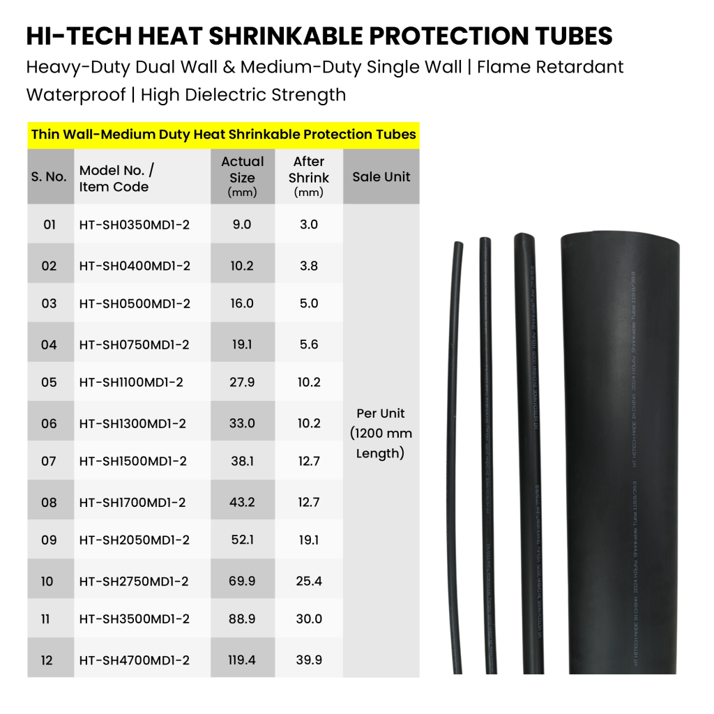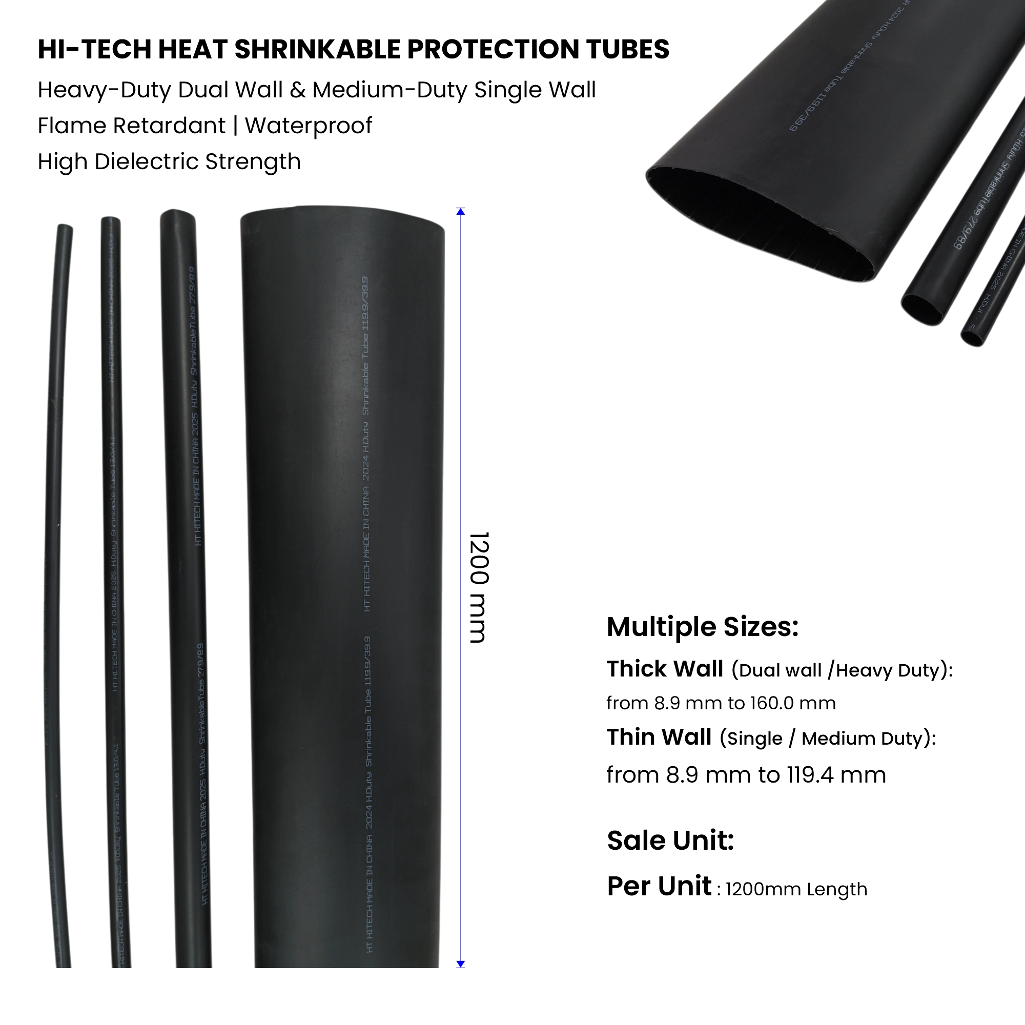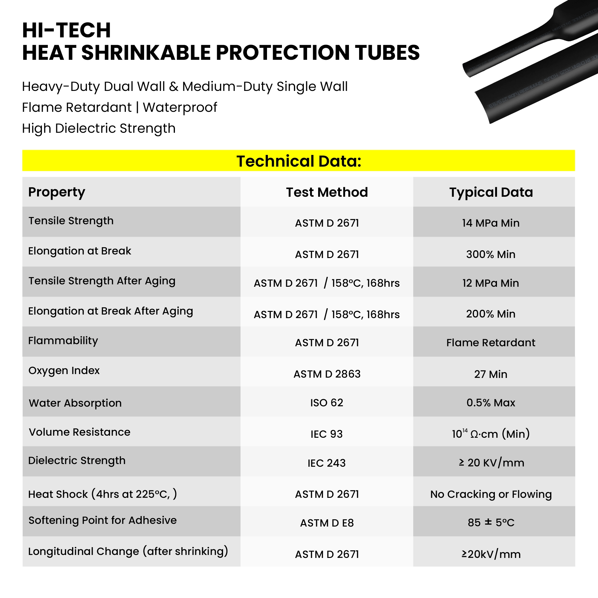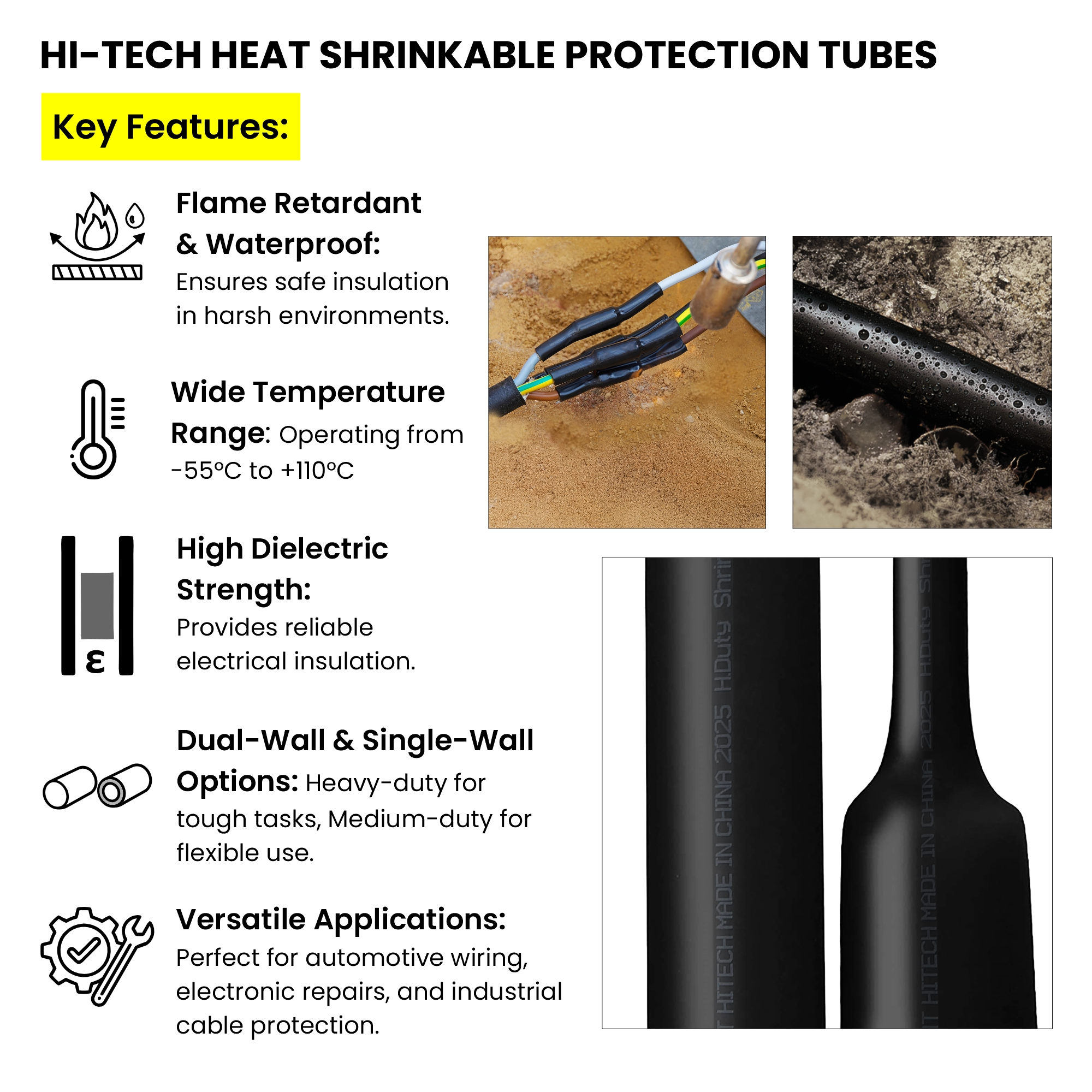 HI-TECH Heat Shrink Tubing serves as the perfect protective and durable solution. The tubing provides performance that is best in its class for applications requiring high temperature tolerance and durable insulation. Its heavy-duty double-walled building equips industrial tasks with exceptional defense against chemicals, together with moisture and abrasion. You can get excellent dielectric strength from medium-duty single-wall tubing, which also provides flexibility for less demanding applications. The flexible tubing works exceptionally well in various applications, including automobile maintenance and electronic equipment installations. Get reliable project simplification through trusted tubing solutions.
