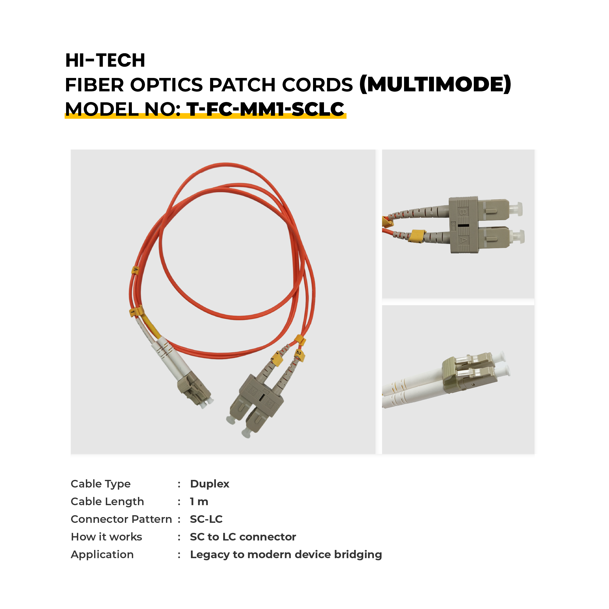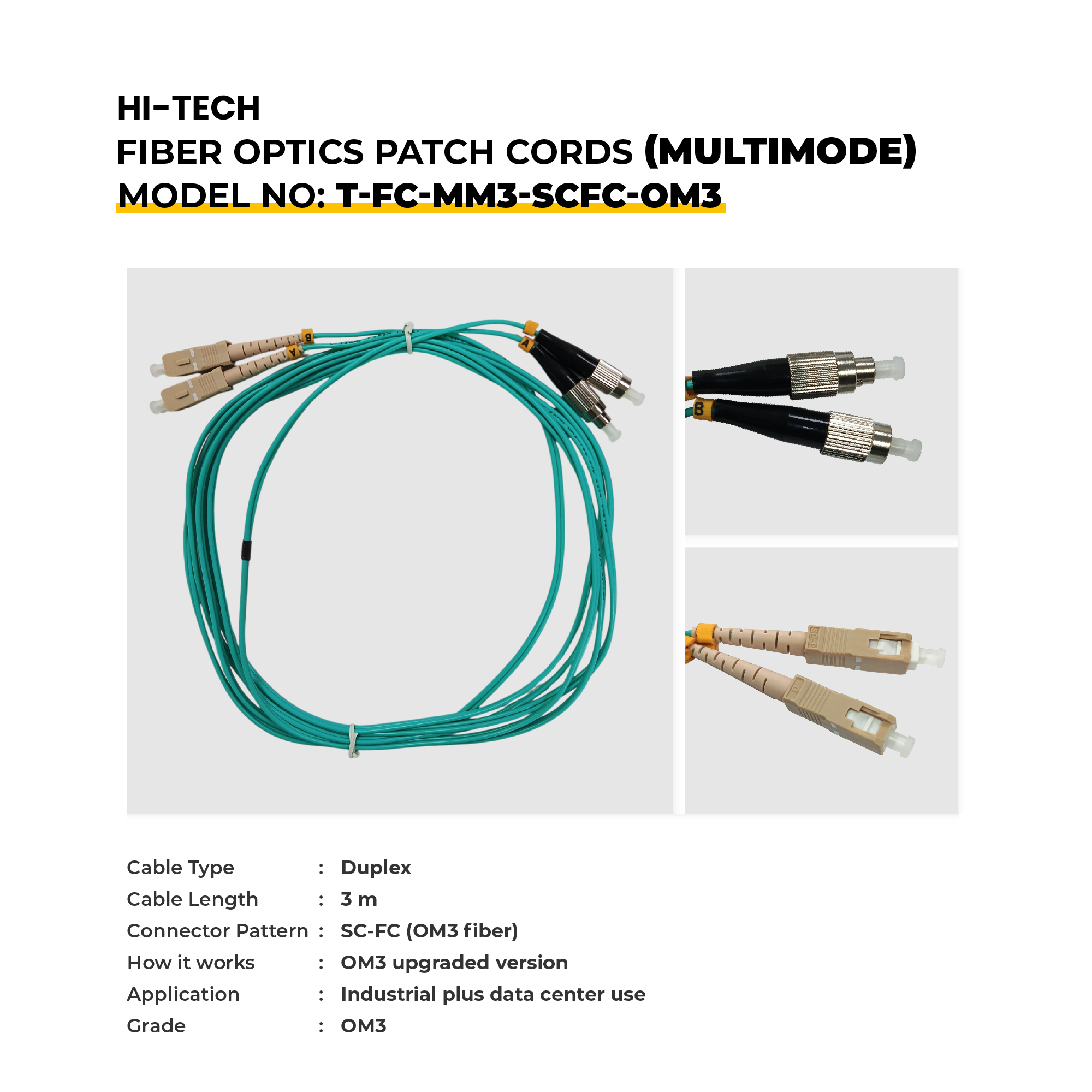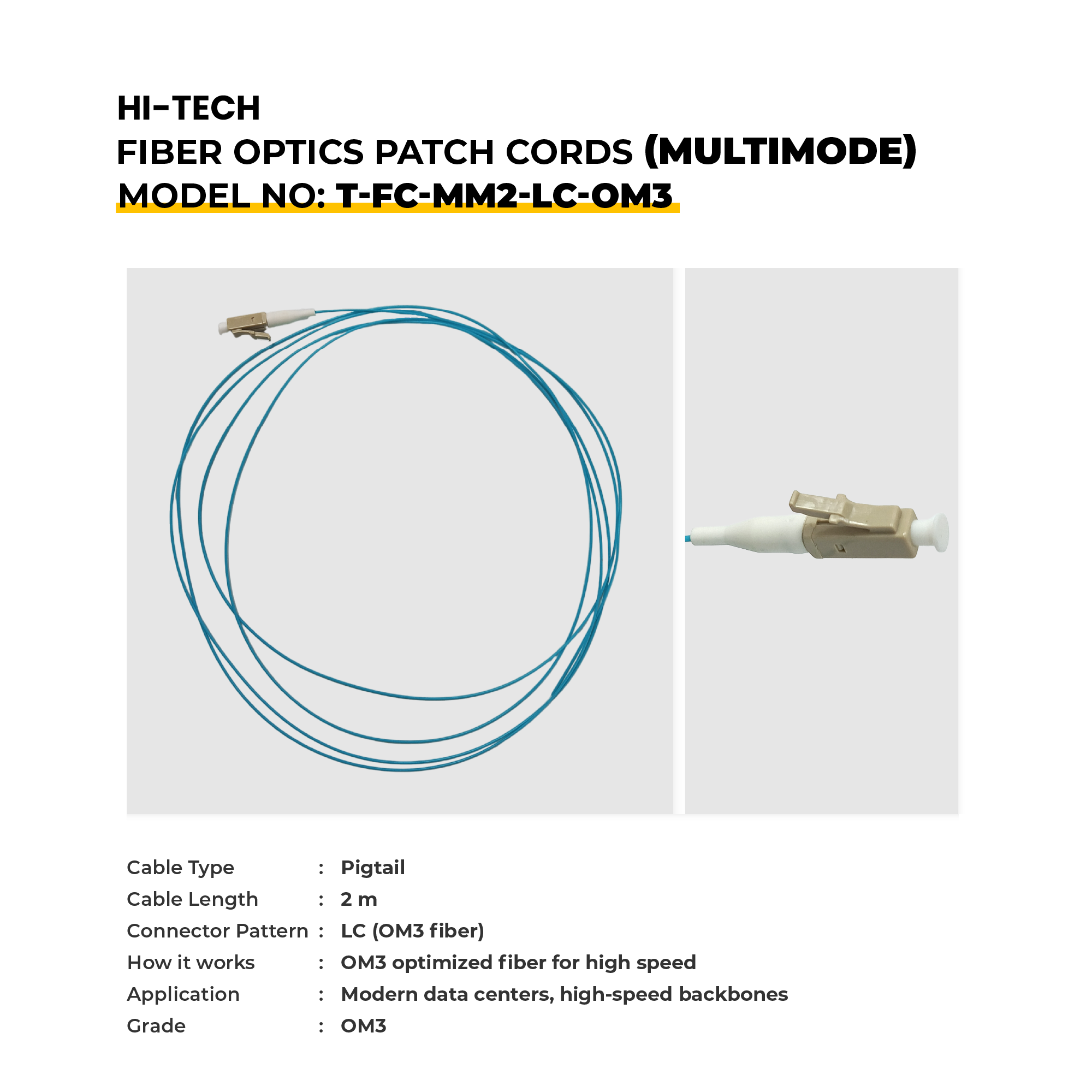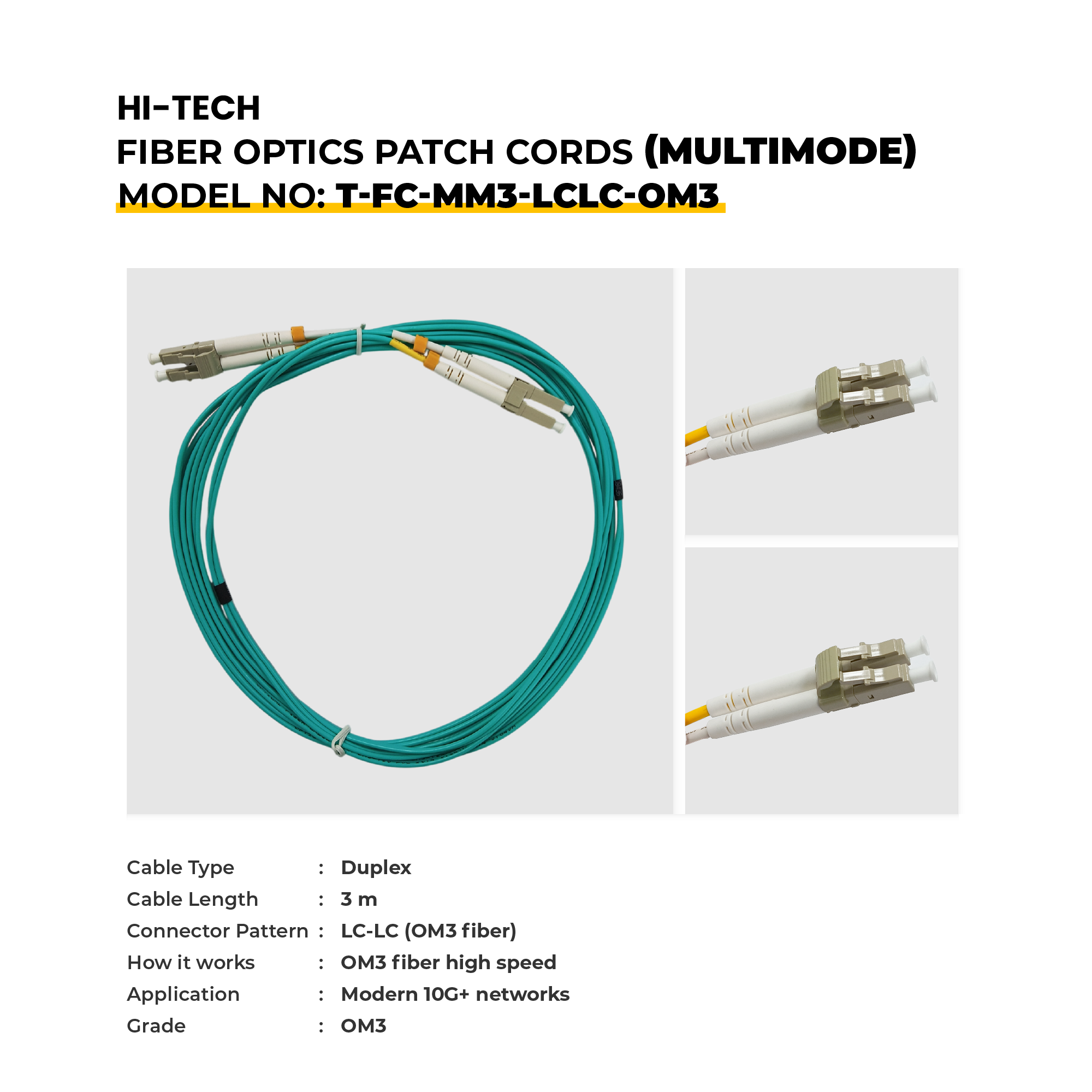 HI-TECH Fibre Optic Patch Cords Multimode provide interconnection with a high level of stability in connectivity and performance in most networking systems, such as data centres, telecom rooms, industrial systems, and enterprise networks. They are available in 1m to 10m lengths and in a range of connector types (LC, FC, SC, and ST), to meet the needs of modern high-density environments as well as hybrid environments. Some models include OM3 fibre to deliver a better performance in 10G/40G/100G high-speed networks. These patch cords can be used on high-stress patch cords that offer low signal loss as well as reliable operation in high-stress environments, such as LANs, telecom and industrial networks.