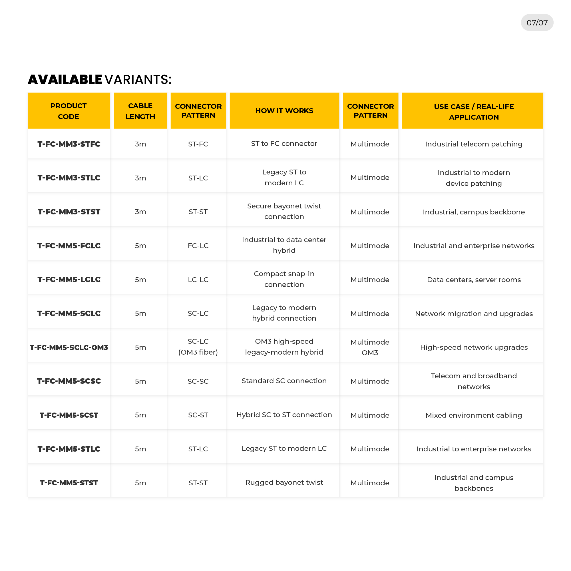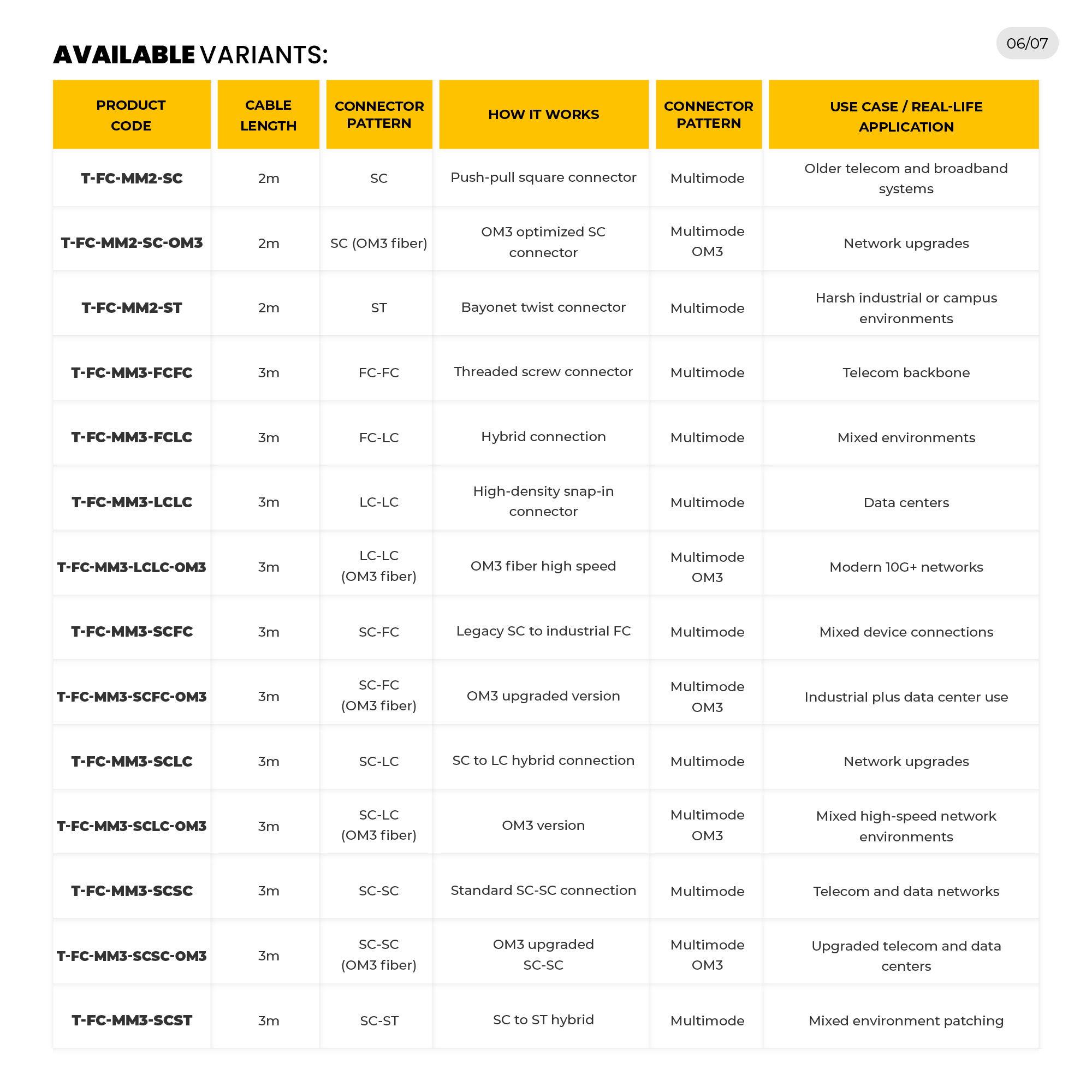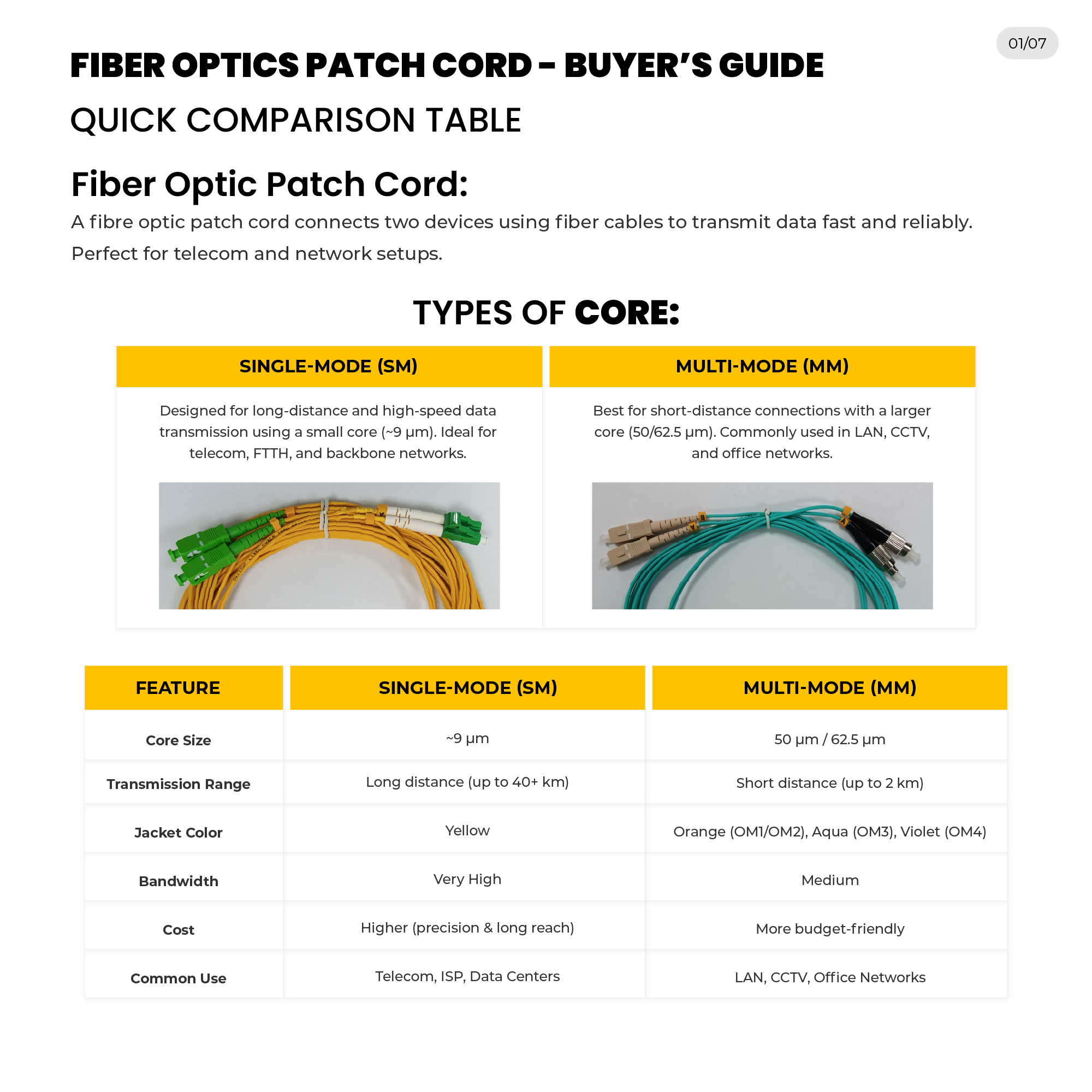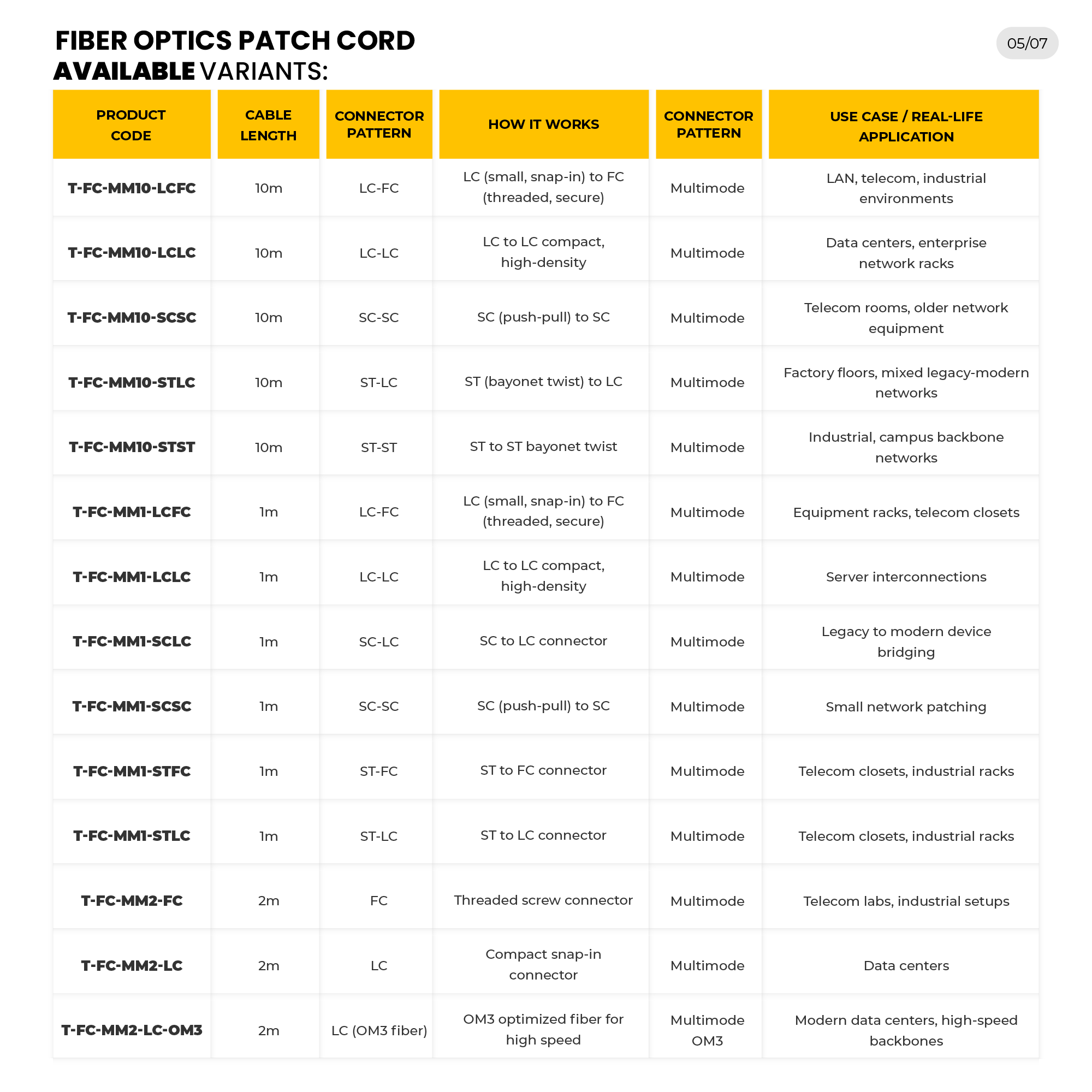 HI-TECH Fibre Optic Patch Cords Multimode provide interconnection with a high level of stability in connectivity and performance in most networking systems, such as data centres, telecom rooms, industrial systems, and enterprise networks. They are available in 1m to 10m lengths and in a range of connector types (LC, FC, SC, and ST), to meet the needs of modern high-density environments as well as hybrid environments. Some models include OM3 fibre to deliver a better performance in 10G/40G/100G high-speed networks. These patch cords can be used on high-stress patch cords that offer low signal loss as well as reliable operation in high-stress environments, such as LANs, telecom and industrial networks.