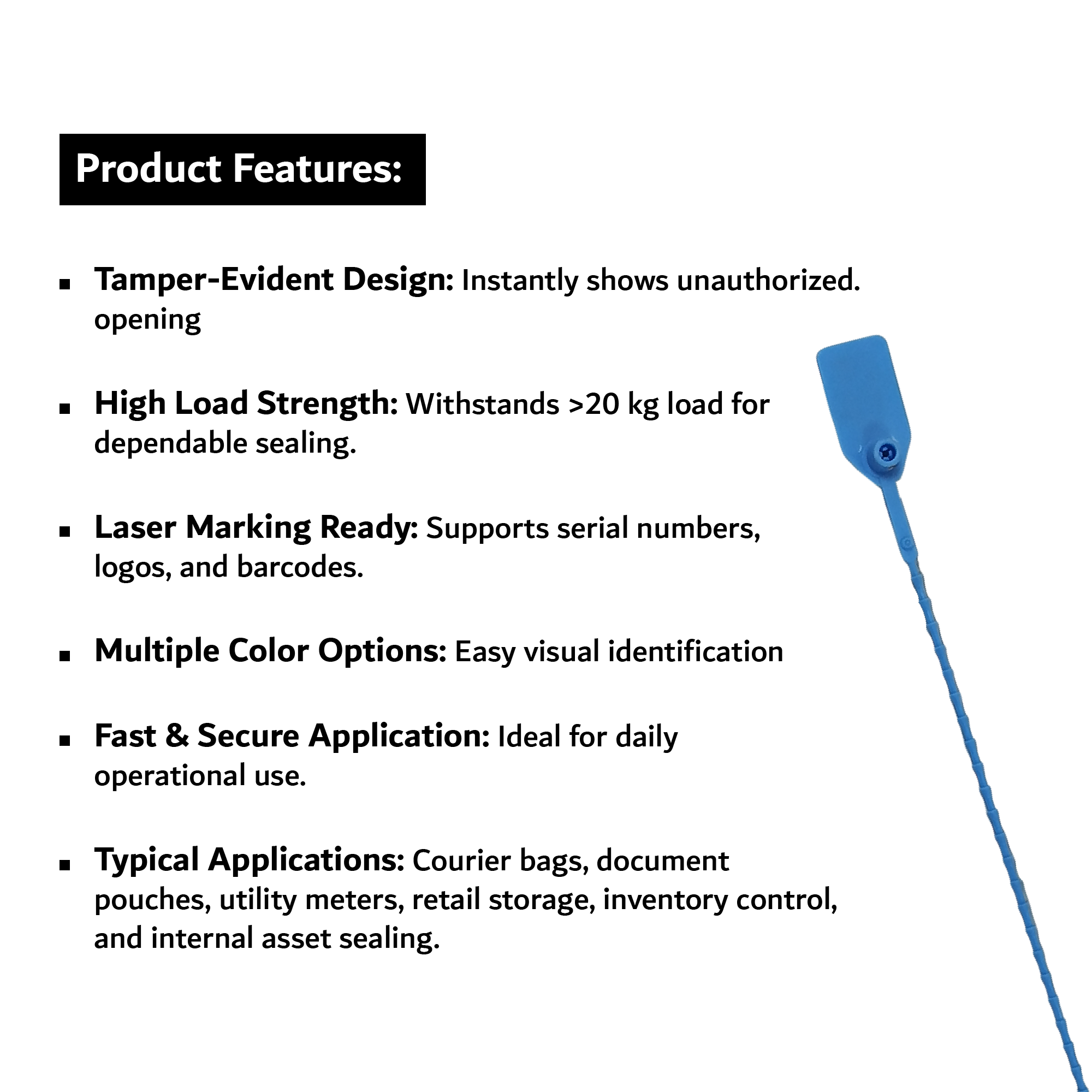 Introducing the HI-TECH Security Seal – HT-SCT-31. Designed for everyday sealing tasks, it offers strong protection and gives you instant evidence if it’s been tampered with. This seal stays secure, holding more than 20 kg before breaking, making it dependable for regular use and still simple to apply. You can also personalize the markings, allowing for easy tracking, clear accountability, and a bit of your own branding, whether you’re in logistics, retail, or utilities.