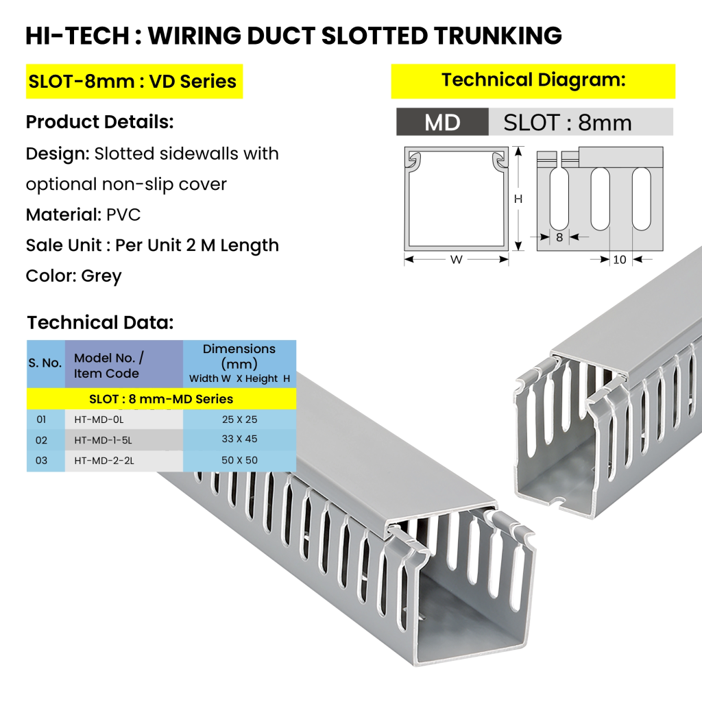 They are designed to make cable entry and exit much easier with parallel slots on both sidewalls, and the non-slip cover option allows cables to remain in place even with vertical installations. HI-TECH Slotted Wiring Duct is available in standard grey colour (custom sizes and colours are available upon request).