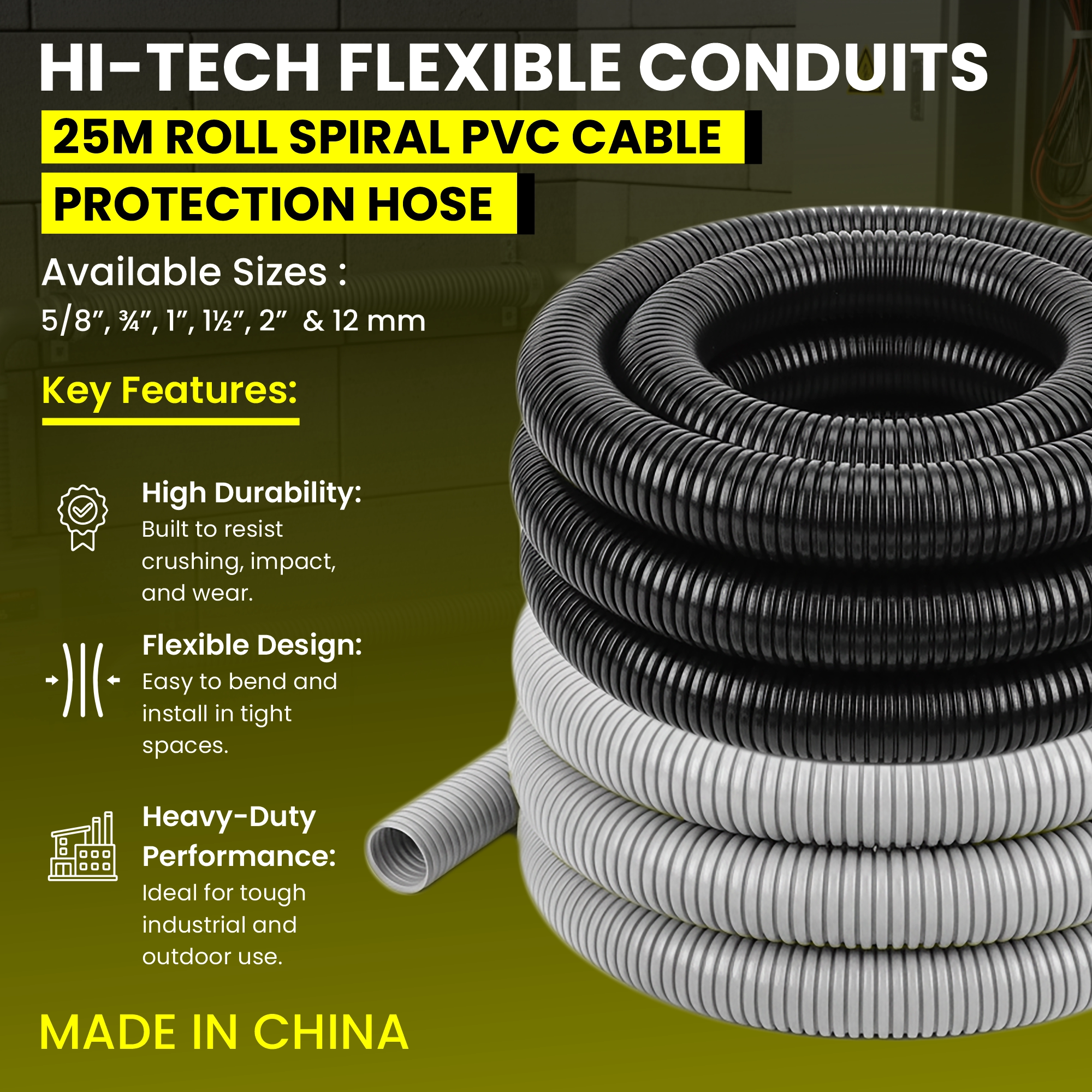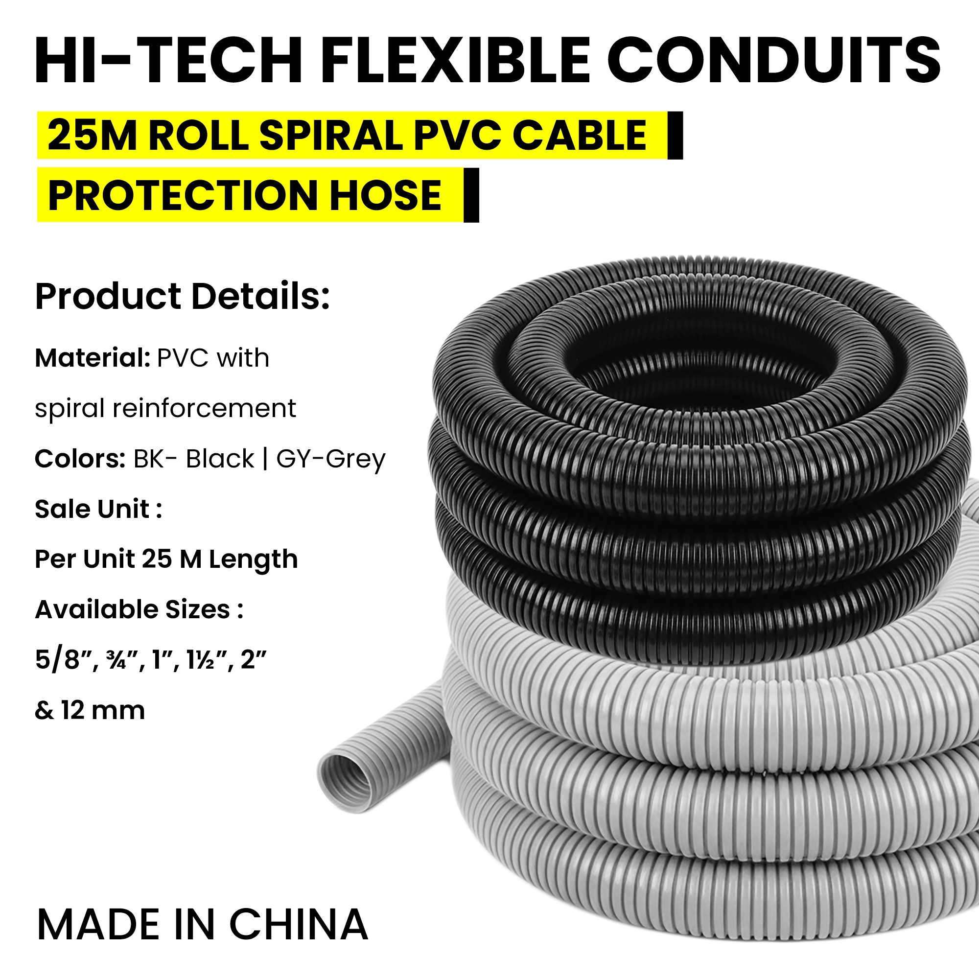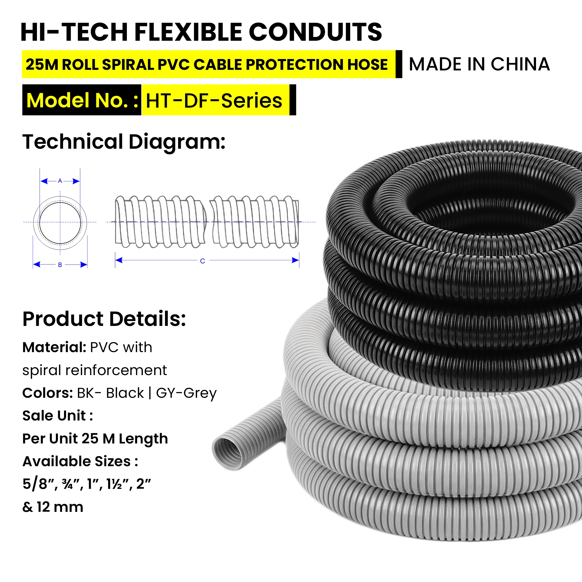 HI-TECH Spiraled Conduit DF Series consist of high-quality spiraled conduits intended to provide excellent assurance of durability and flexibility in electrical and industrial applications. These heavy-duty conduits come in 25-meter (6 ft) Lengths and in various sizes (5/8, 3/4, 1, 1-1/2, and 2 inches) and guides (Black and Grey). These spiralled conduits were designed and produced with care to ensure high levels of resistance to bending, external pressure, and impact, making them a trustworthy option when it comes to keeping wires and cables safe in harsh conditions.
