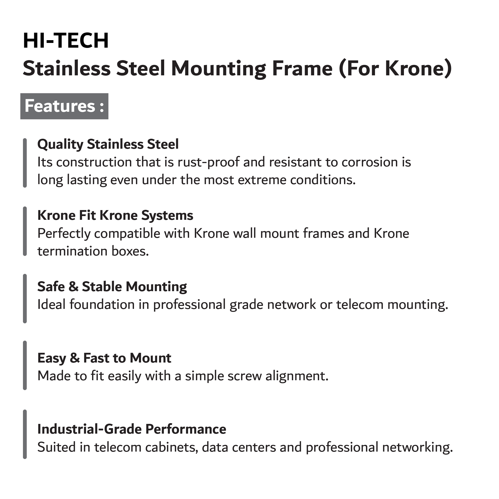 The HI-TECH Stainless Steel Mounting Frame is a solid and suitable method of placing Krone wall mount frames securely and termination boxes. It is made out of corrosion-free stainless steel and is suited to operate extensively in tough areas like telecom rooms, data centres, and industrial facilities. This mounting frame can be installed fast, easily and professionally due to tight screw positioning and Krone compatibility. This frame is stable and robust, whether you are upgrading or starting a new network infrastructure.