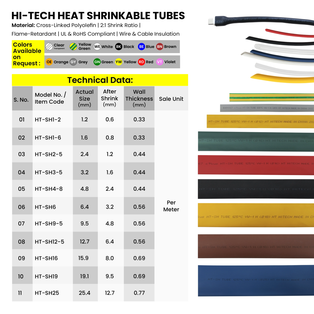 HI-TECH Shrinkable Tubes can be used for repairing electrical wires, tubing, and other similar items. When heated to above 100°C (212°F), this tape will shrink to more than 30% of its original size, providing a waterproof repair for your chosen component. This adhesive insulation tape also protects against corrosion. Constructed with an environmentally friendly heat-melted adhesive. Continuous operating temperature: -55°C to 105°C (-67°F to 221°F).