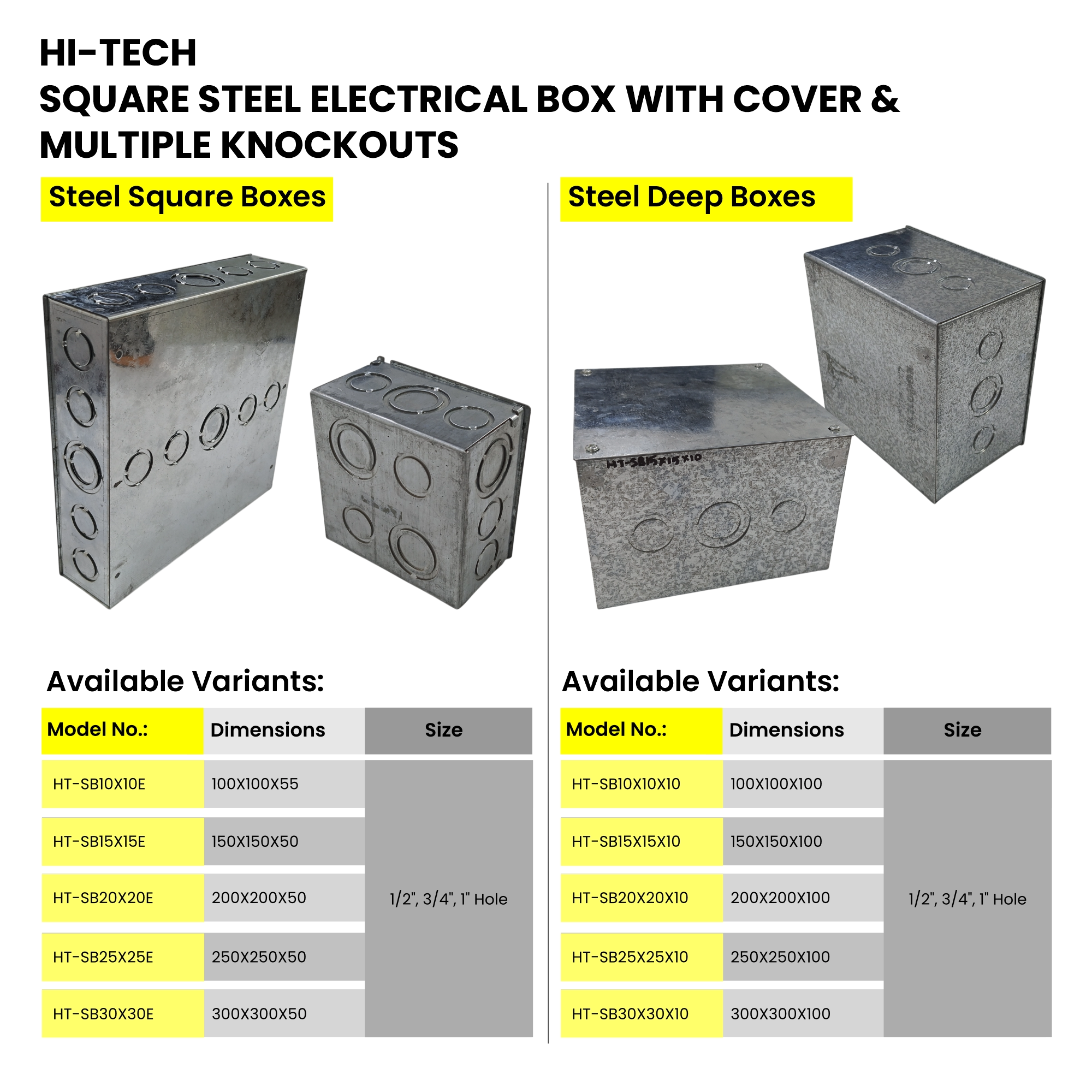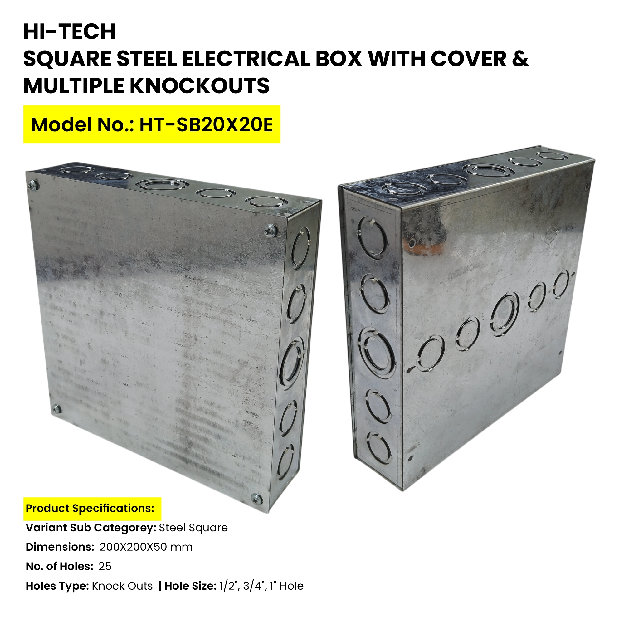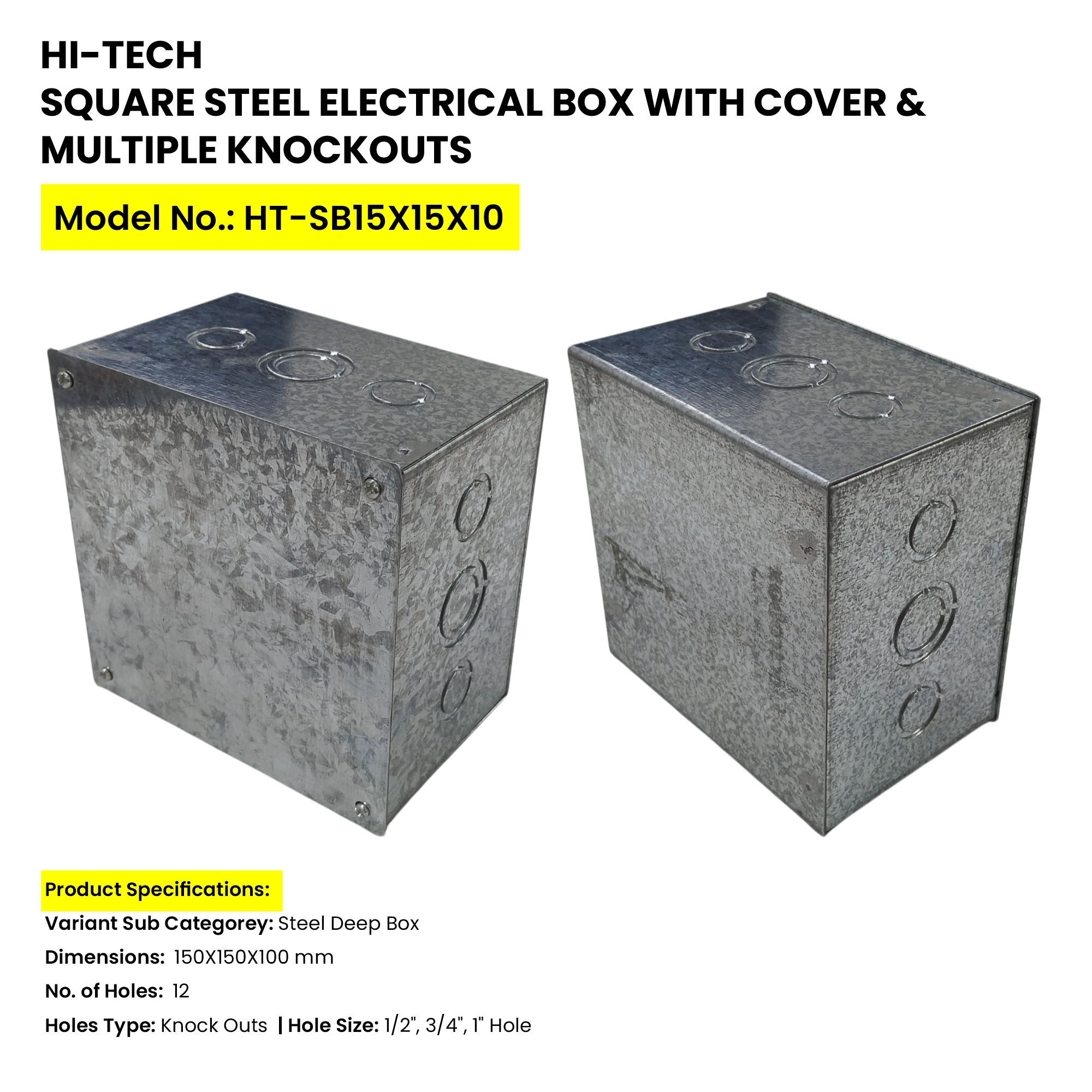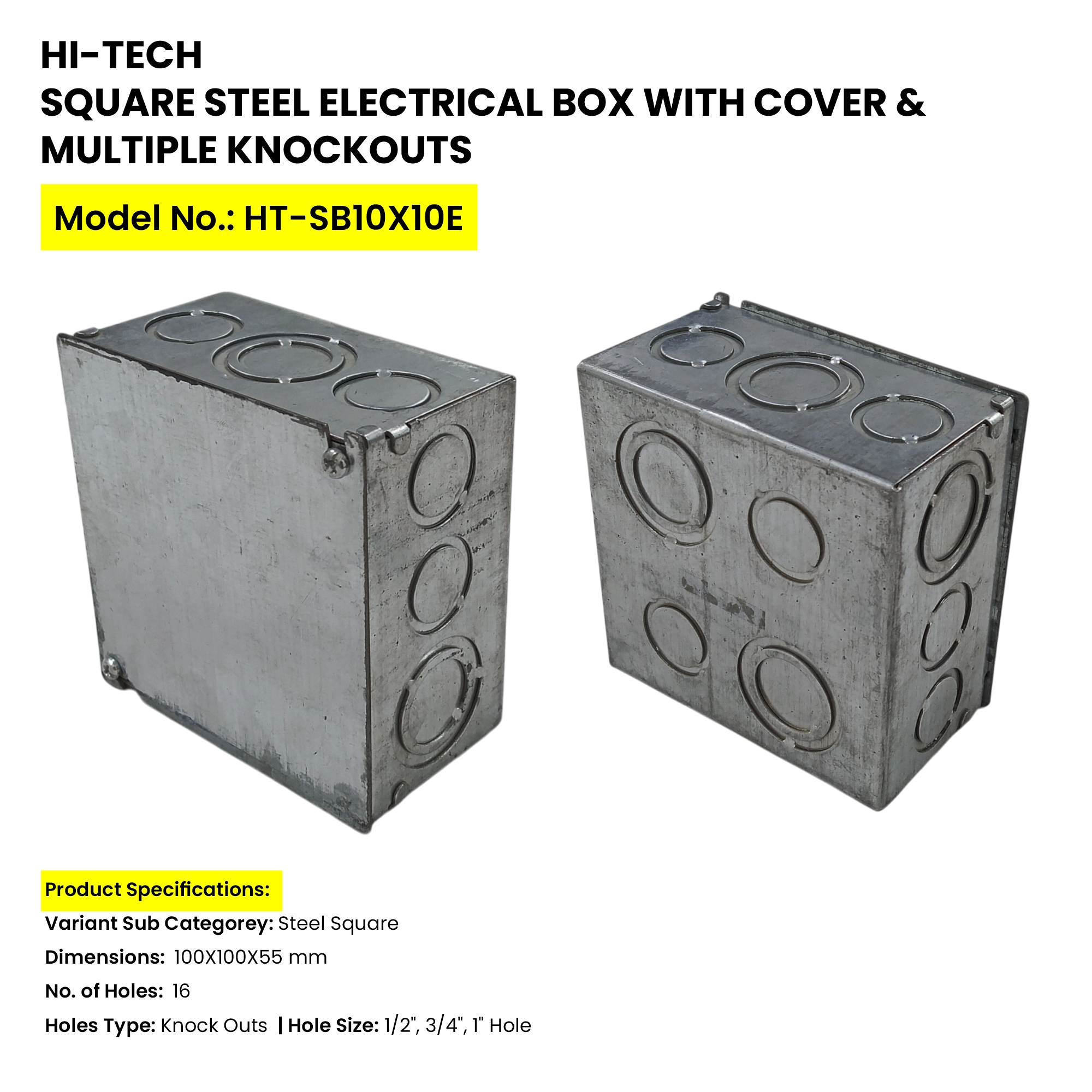 HI-TECH Steel Boxes with covers and knock-outs are high-performance grade, custom-made electrical enclosures that are durable, safe, and useful. Such steel rectangular boxes come measuring up as square-shaped, and they are well suited to the distribution of power to multiple electrical devices where the conductor runs should have the potential to divide to proceed in two or even more directions. These multiple knockouts are easy to wire and connect and are ideal for complex installation of electrical installations in residential, commercial and industrial sectors. These boxes are suitable for both surface mount and flush mount types of installations and fit multi-directional duct runs and are commonly mounted to lighting fixtures, switches and other outlet devices. Their large design provides a safe and neat distribution of wiring.