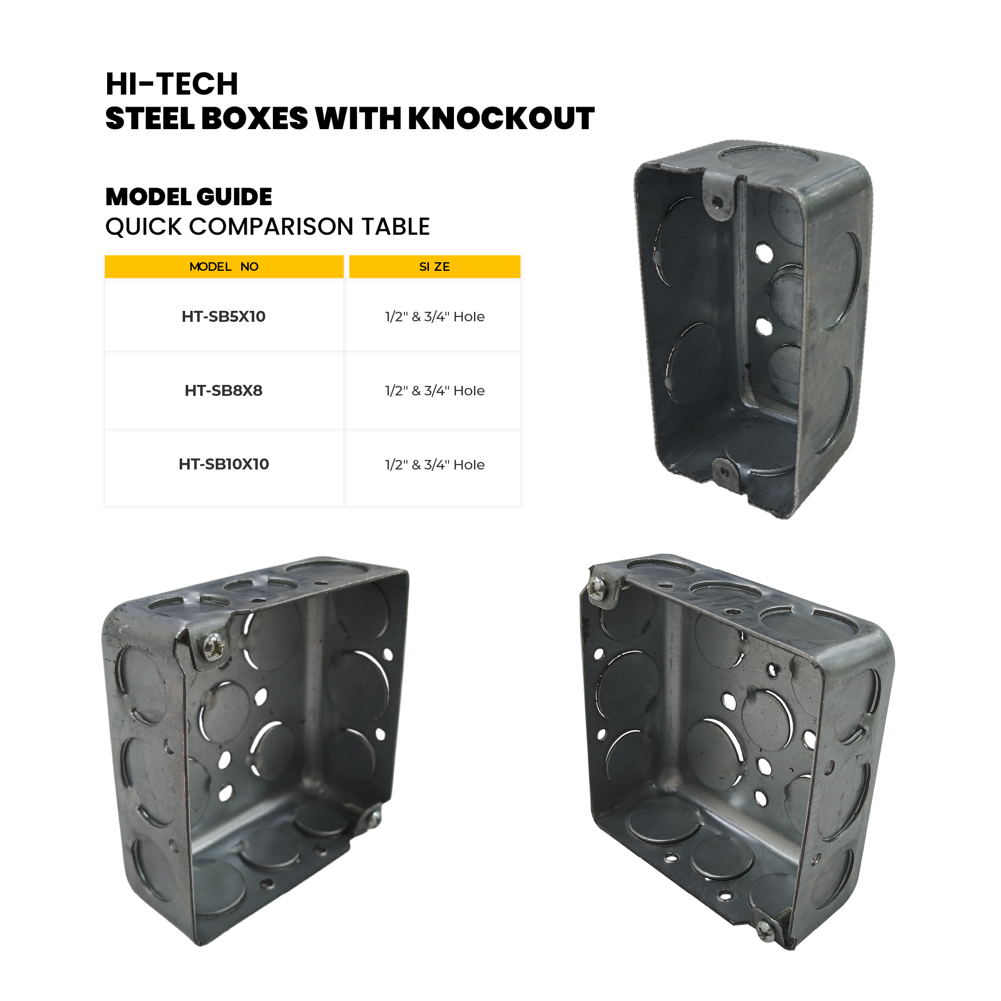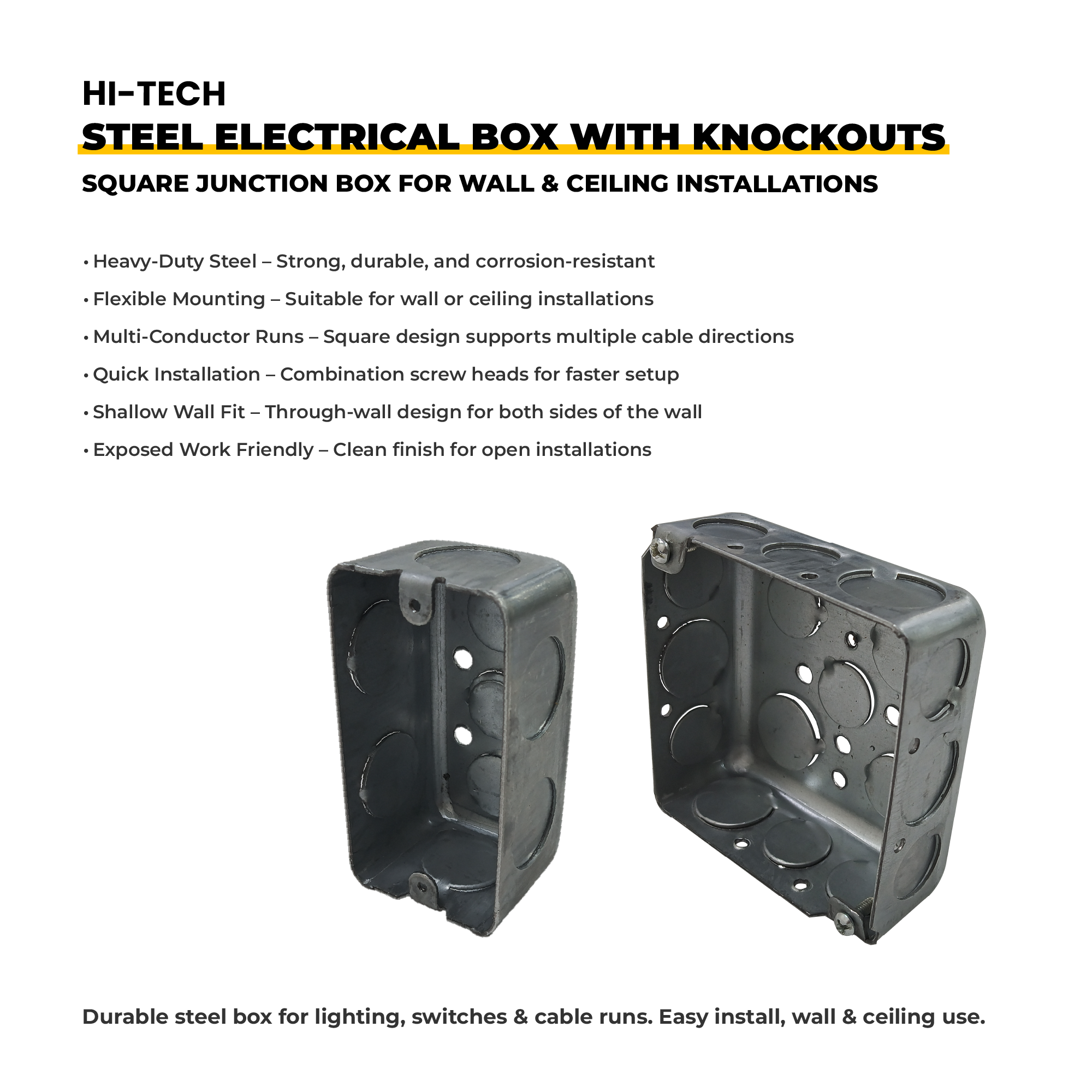 HI-TECH Steel Electrical Boxes with Knockout are made to the requirements of electricians and contractors who require heavy-duty enclosures that can be used in a variety of applications. They are square that facilitates many conductor fields as well as through-wall that enables installations of cables along walls without interruption. The screw heads are made for fast installation, and the heavy-duty steel is robust, durable for any project, ceiling, or wall.