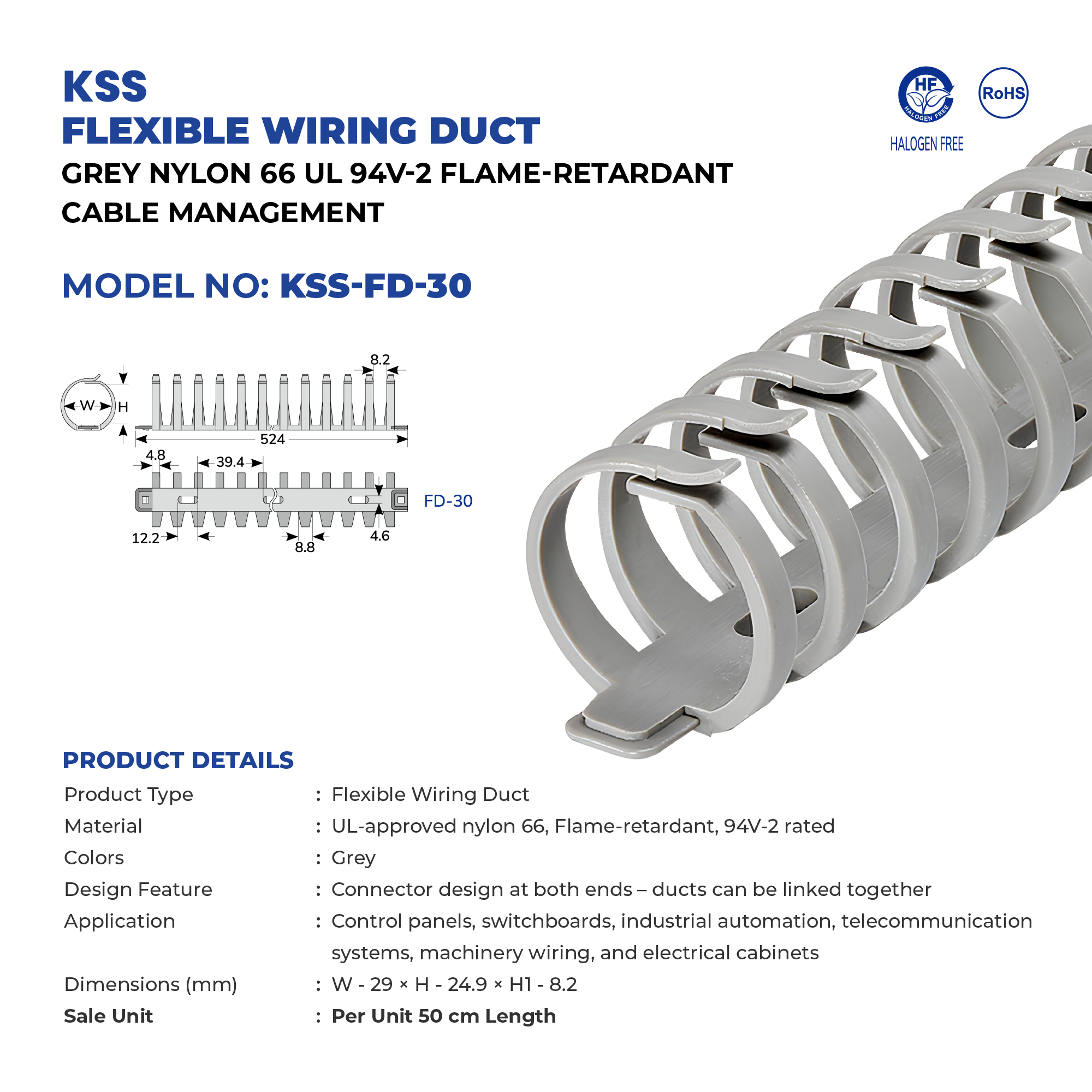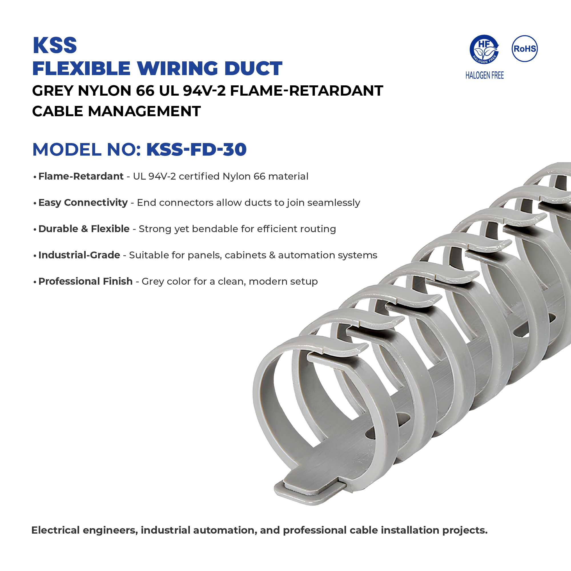 The KSS Flexible Wiring Duct is a flexible wiring duct designed to manage electrical panels, control cabinets, and industrial installation applications in a clean, safe, and professional manner. This duct is made using Nylon 66 (94V-2), which is a superior, highly flexible, durable and flame-resistant material. The connector design at both ends allows easy joining of multiple ducts, thus making it easy to install and organize wires and cables in a better way. The grey colour offers a professional finish that blends with contemporary electrical enclosures.