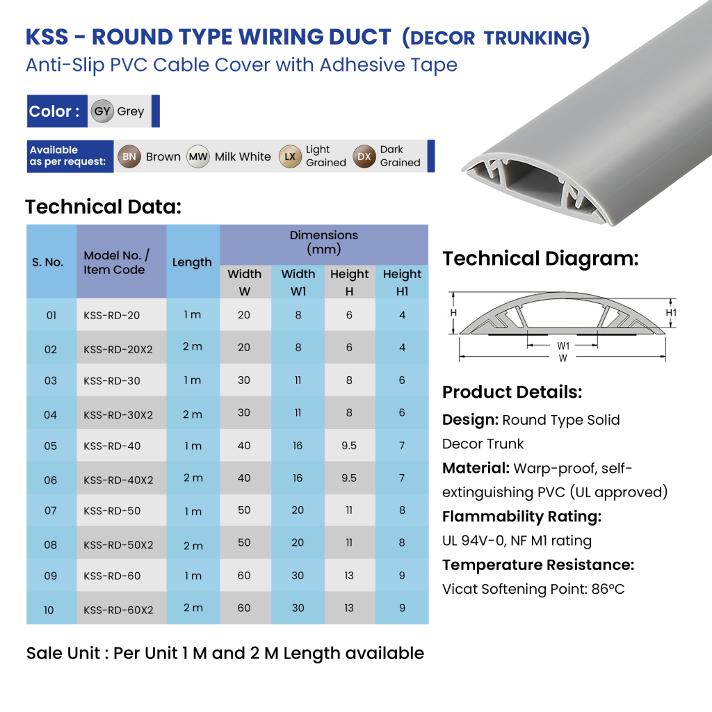 KSS Round Type Wiring Duct is a modern cable handling system that enables cable management to be safe, durable and smooth to the eye in commercial and public areas. This duct is made of warp-proof self-extinguishing UL-rated PVC with 94V-0 flammability rating and M1 NF fire resistance certification, thus offering a high level of protection against fire hazards and extended performance.