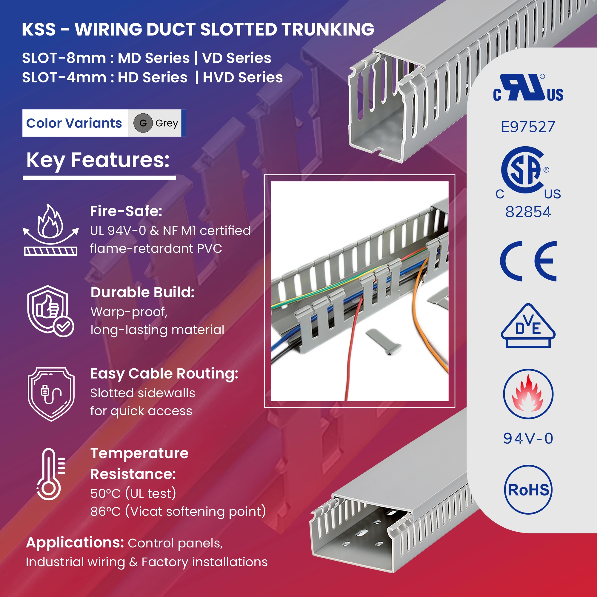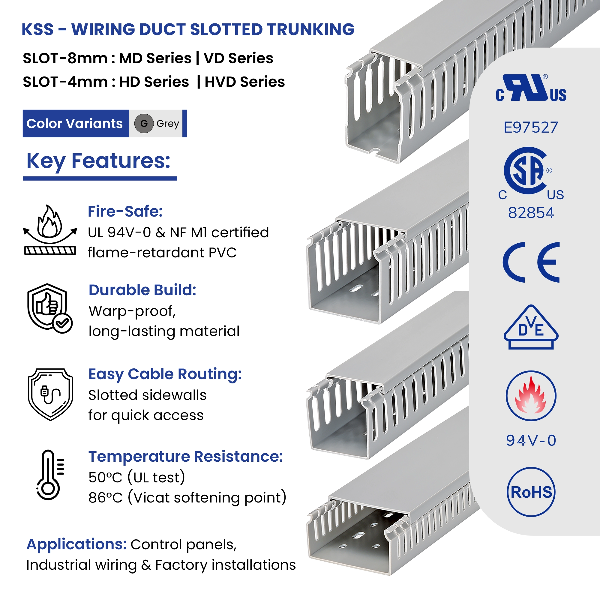 KSS Slotted Trunking is a high-quality product used to arrange, route and shield electrical wires and cables used in industrial and commercial applications. These wiring ducts are manufactured using self-extinguishing, warp-proof UL-approved PVC material with a 94 V-0 flammability rating and M1 NF fire resistance certification to ensure long-term safety and efficiency.
