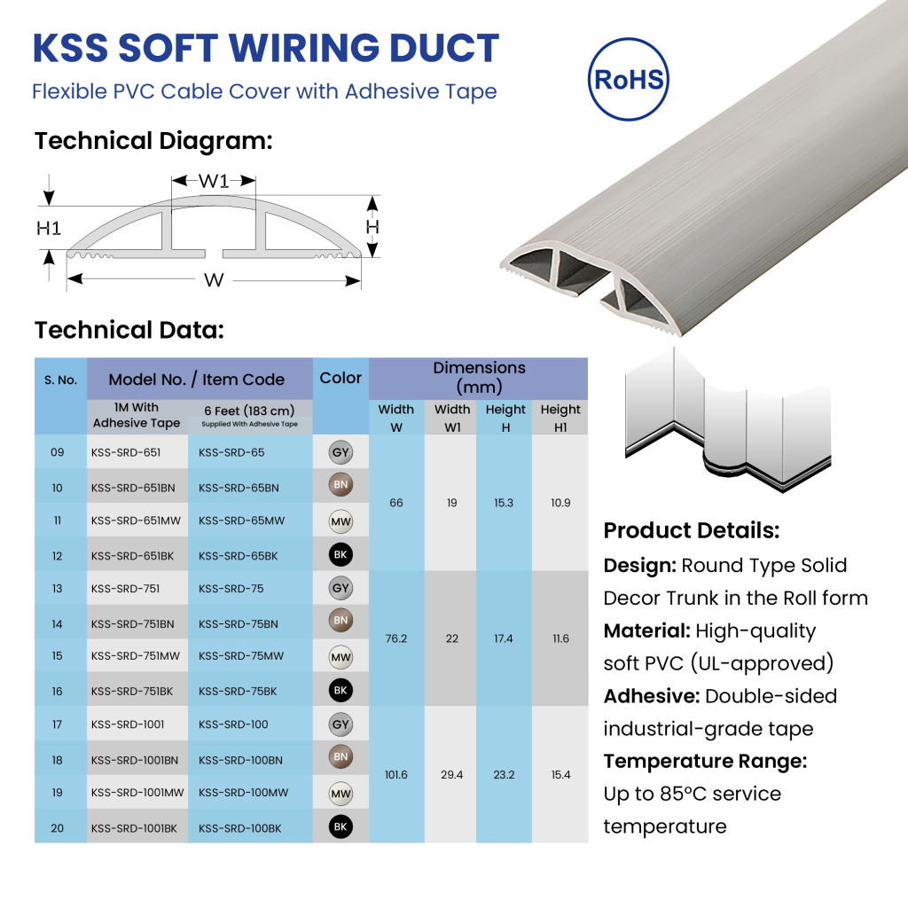 The duct is fitted with high-quality double-sided adhesive tape, which enables it to be attached easily and securely without extra tools. The KSS Soft Wiring Duct comes in standard Grey Brown, Milk, and Black colour, and it can be used in offices, homes, and industrial settings.