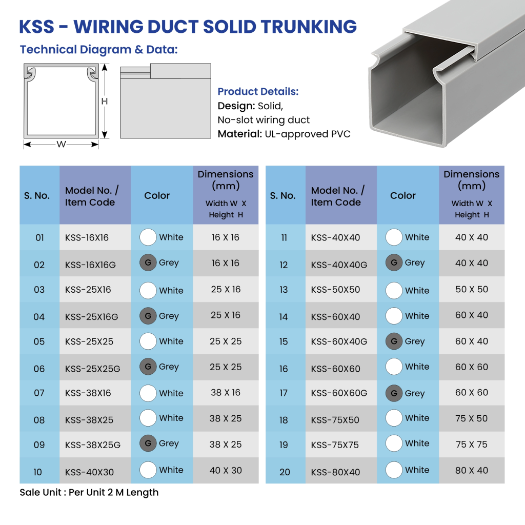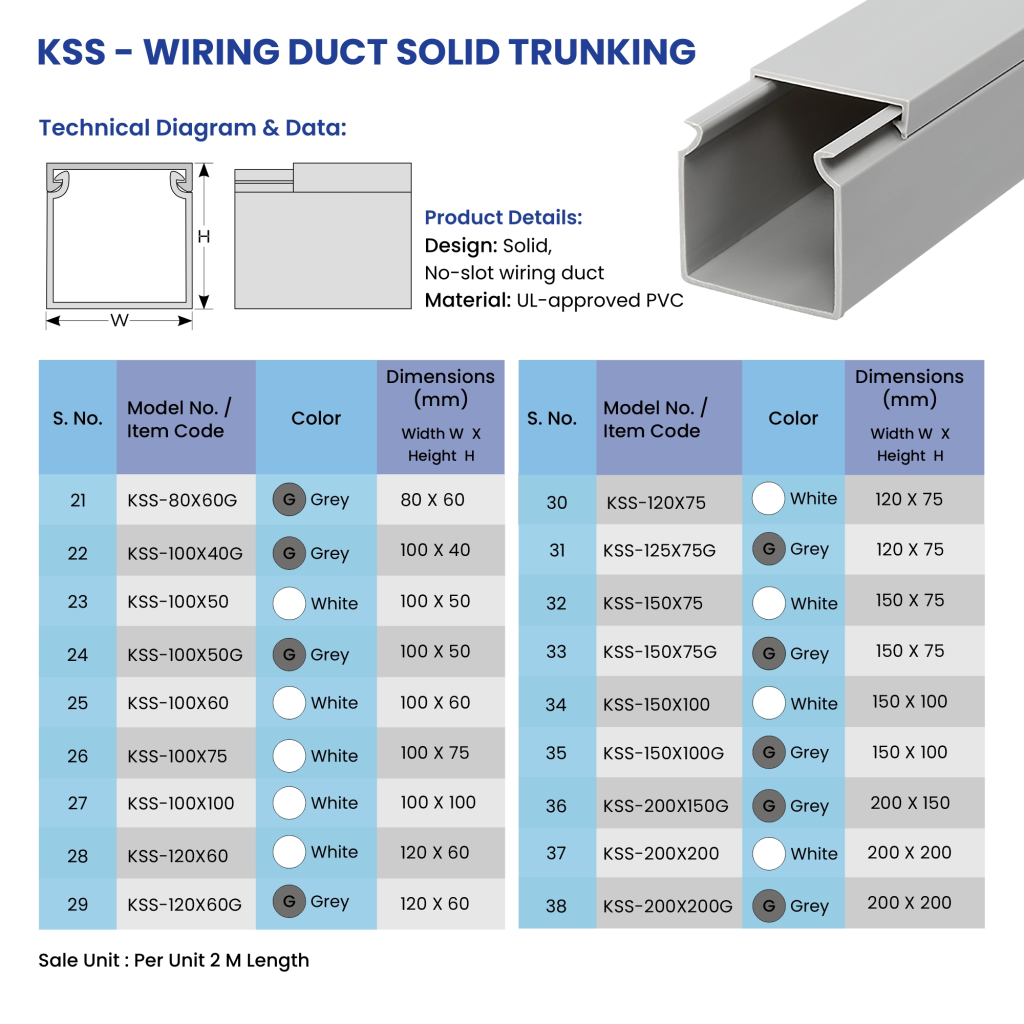 KSS Solid Trunking is a high-grade wiring duct used to ensure the safety and efficient handling of cables in industrial and commercial environments. It has a no-slot design, and this makes it best suited to external wiring, and installations where one does not need to extract the wire. This trunking is made of self-extinguishing UL-approved PVC, which is warp-proof and offers a high level of durability, flame resistance (94V-0 rating), and compliance with the NF M1 fire tests. Its Vicat softening point of 86 °C and UL test performance of 50 °C make it capable of enduring harsh environments, coupled with insulating the cables against external damage like dust, rodents and physical impacts.