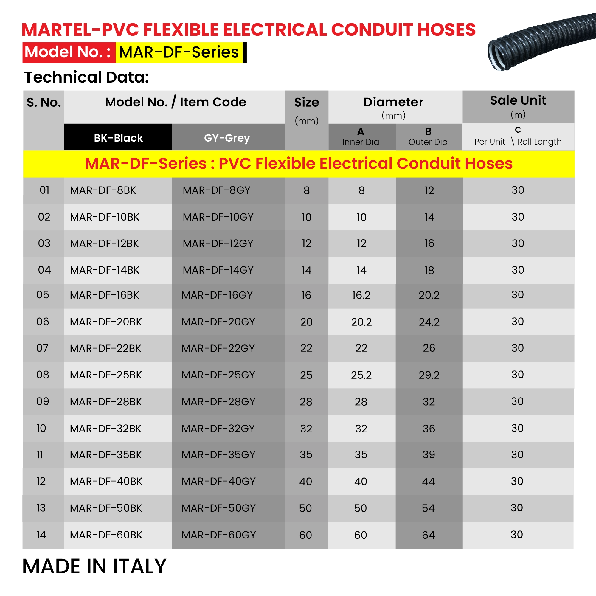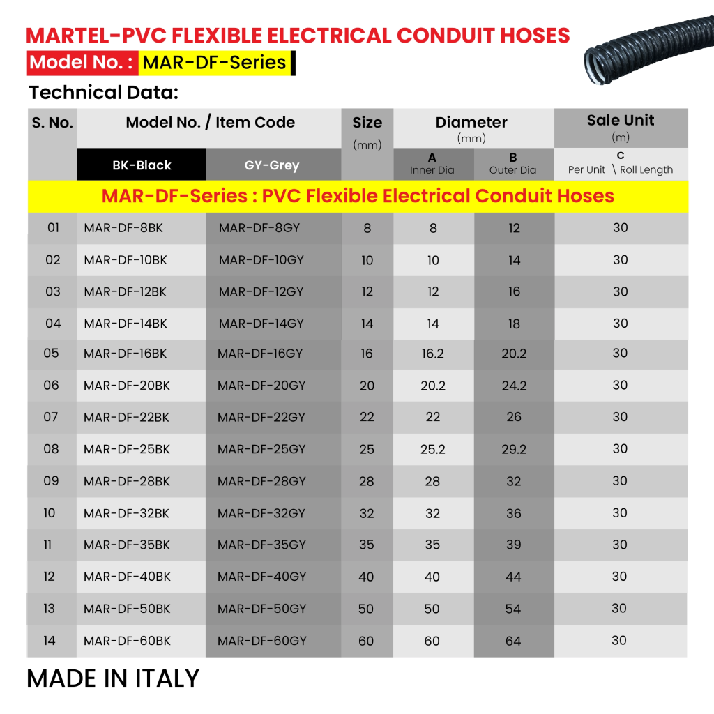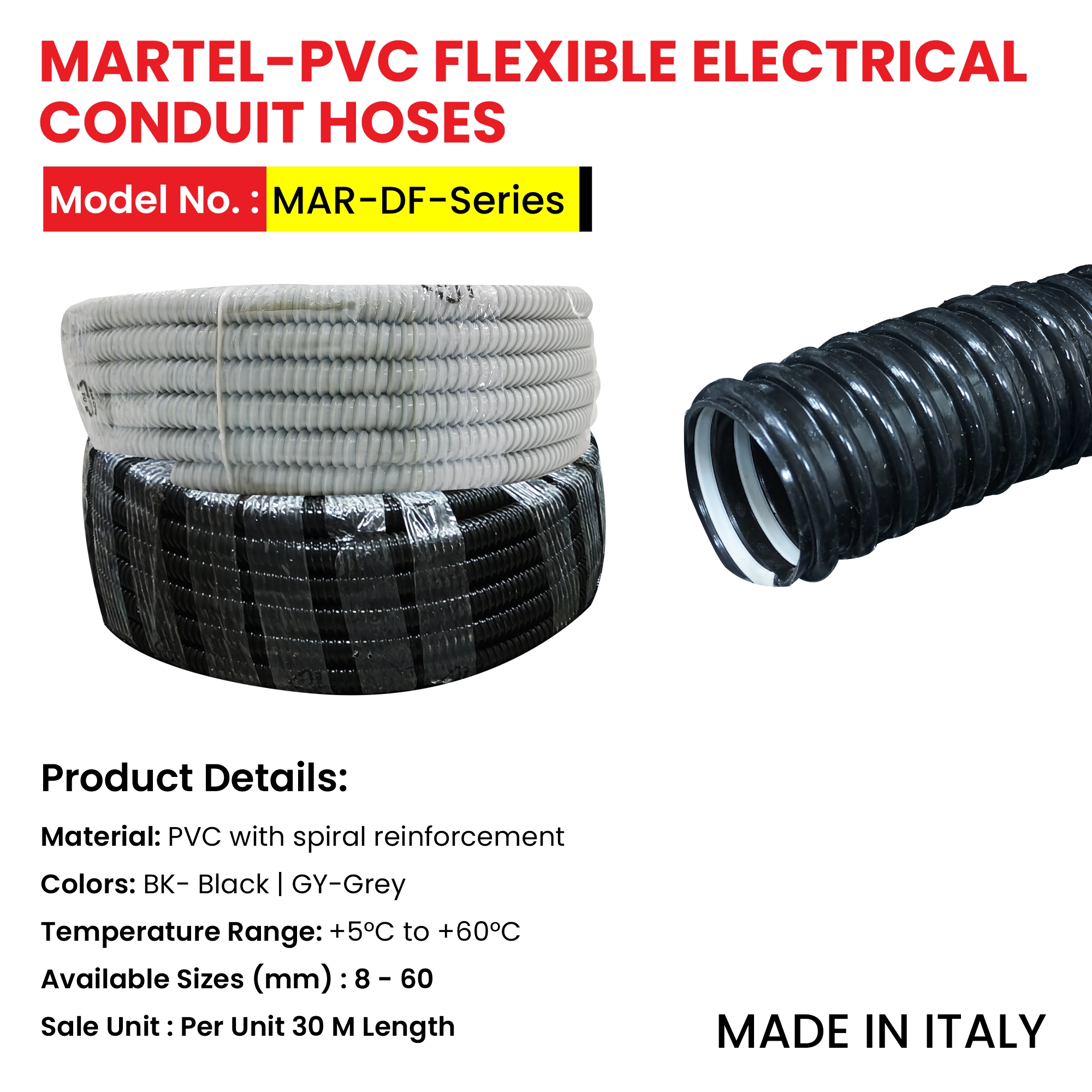 MARTEL PVC Flexible Hoses are engineered to provide durability, flexibility and reliability for electrical and industrial applications. Each roll is available in lengths of 30 meters and a variety of inner and outer diameter sizes to suit various installation requirements. Manufactured from PVC-based thermoplastic rigid spiral reinforcement with a PVC-based coating as a covering, these hoses are designed to be self-extinguishing for superior safety against fire hazards. They are ideal for electrical wiring protection, conduit management and industrial cable-routing performance and safety.