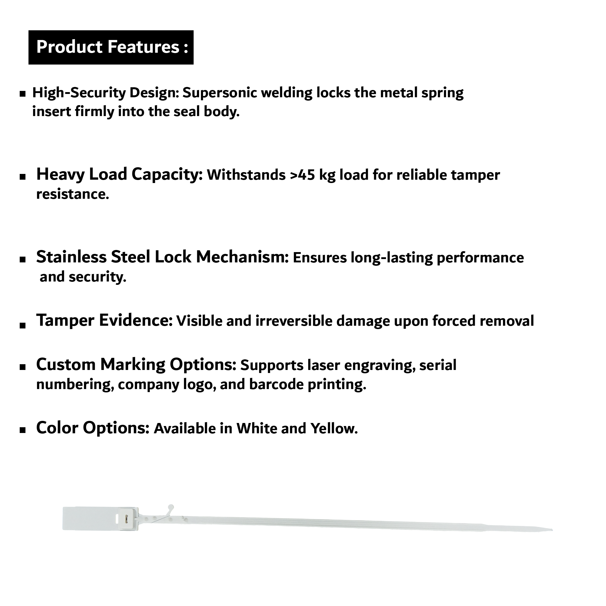 The HI-TECH Security Seal – HT-RSCT-072B delivers serious durability for tasks requiring extra pull resistance and visible evidence of tampering. It withstands over 45 kg before breaking, making it stronger than most standard seals, yet it’s still easy to apply. Supersonic welding secures the metal spring insert inside the body, while the stainless steel locking mechanism ensures security and makes any tampering immediately noticeable.