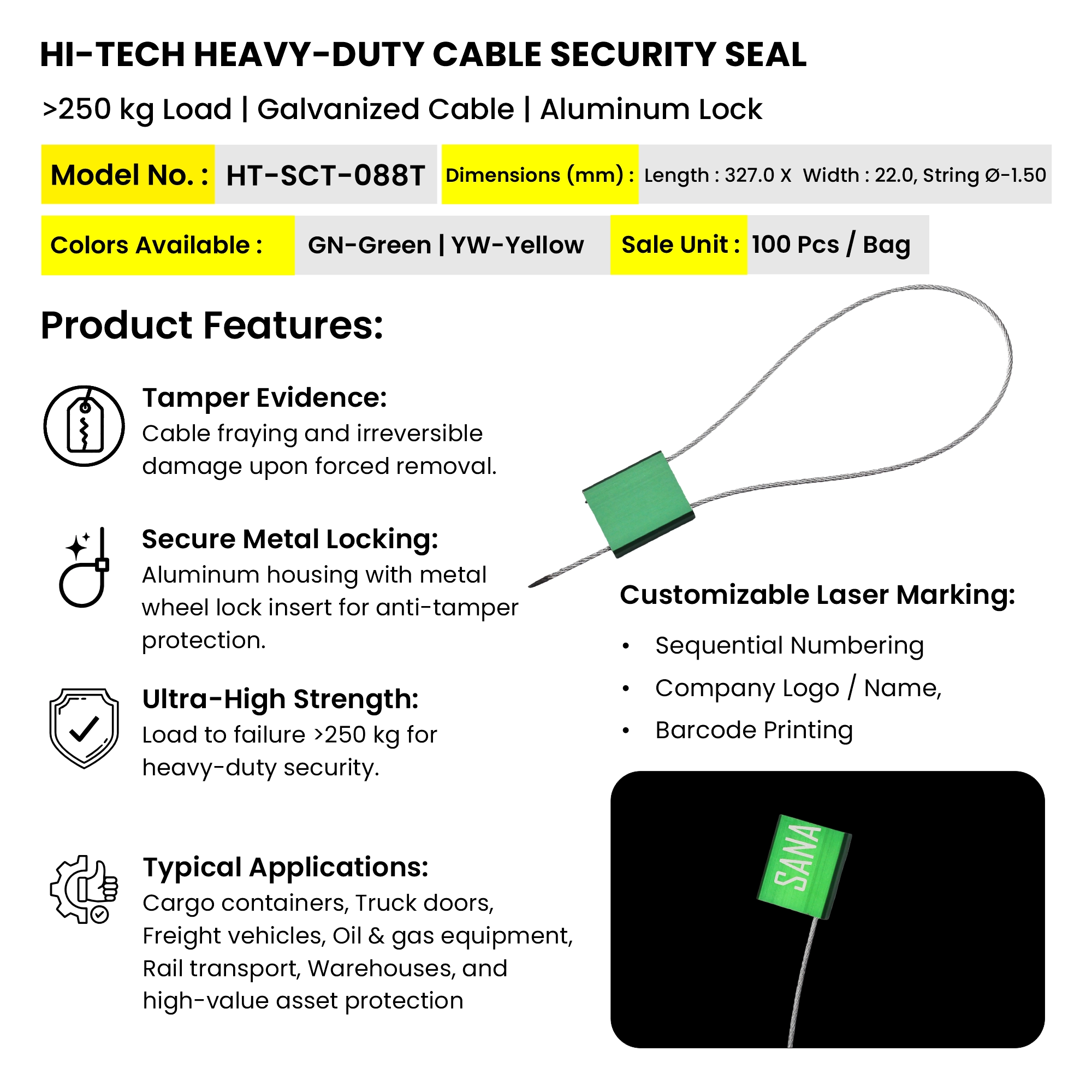 HI-TECH Security Seal – HT-SCT-088T is a powerful cable seal to use in risky and high-value applications. It has the ability to support over 250 kg as well as breaking, and this feature prevents theft and unauthorized access. It is made of 1.5 mm galvanized steel cable with hard aluminium lock and metal wheel lock, which is difficult to cut, pull or tamper with it. You are able to add personal markings in order to monitor and keep people accountable to critical tasks.