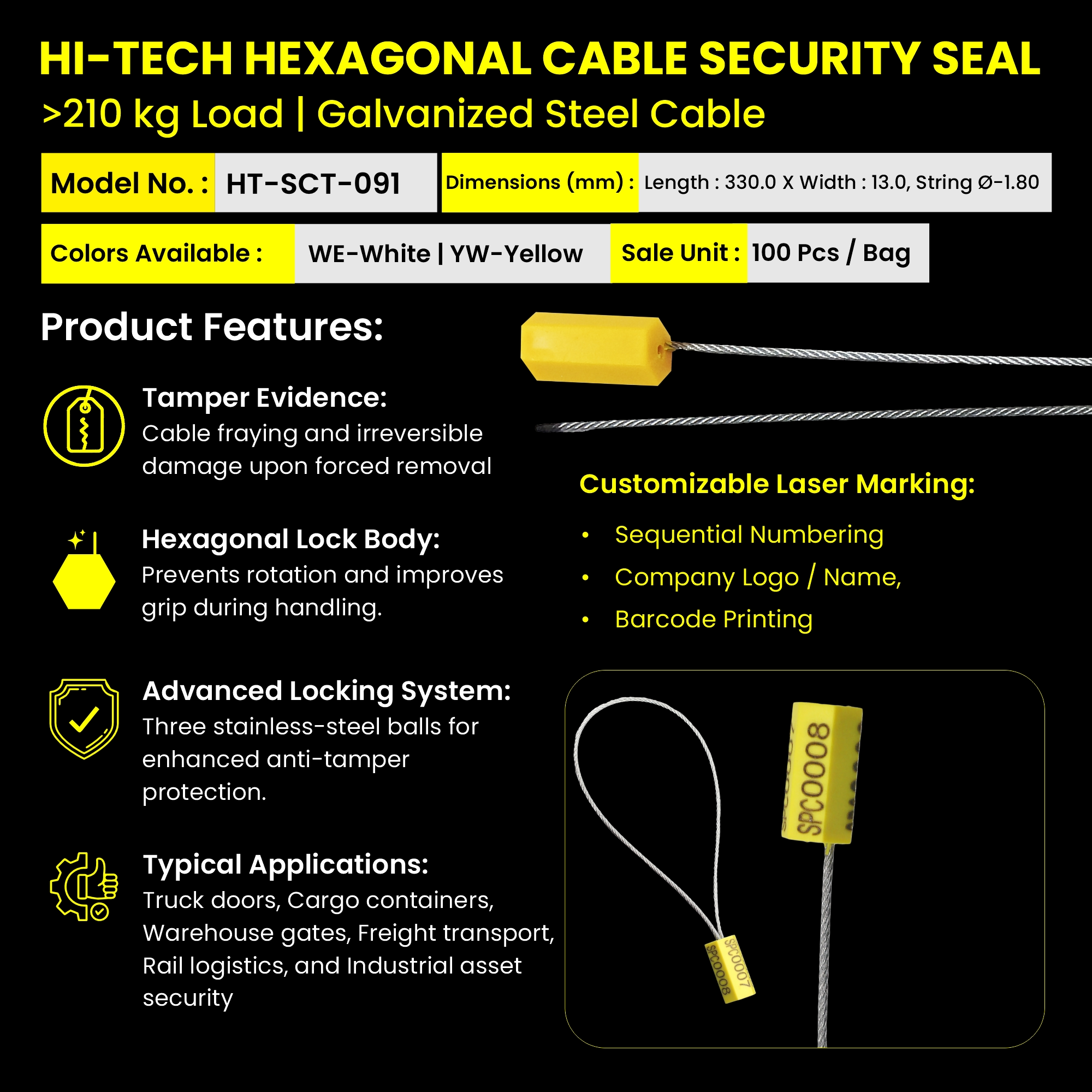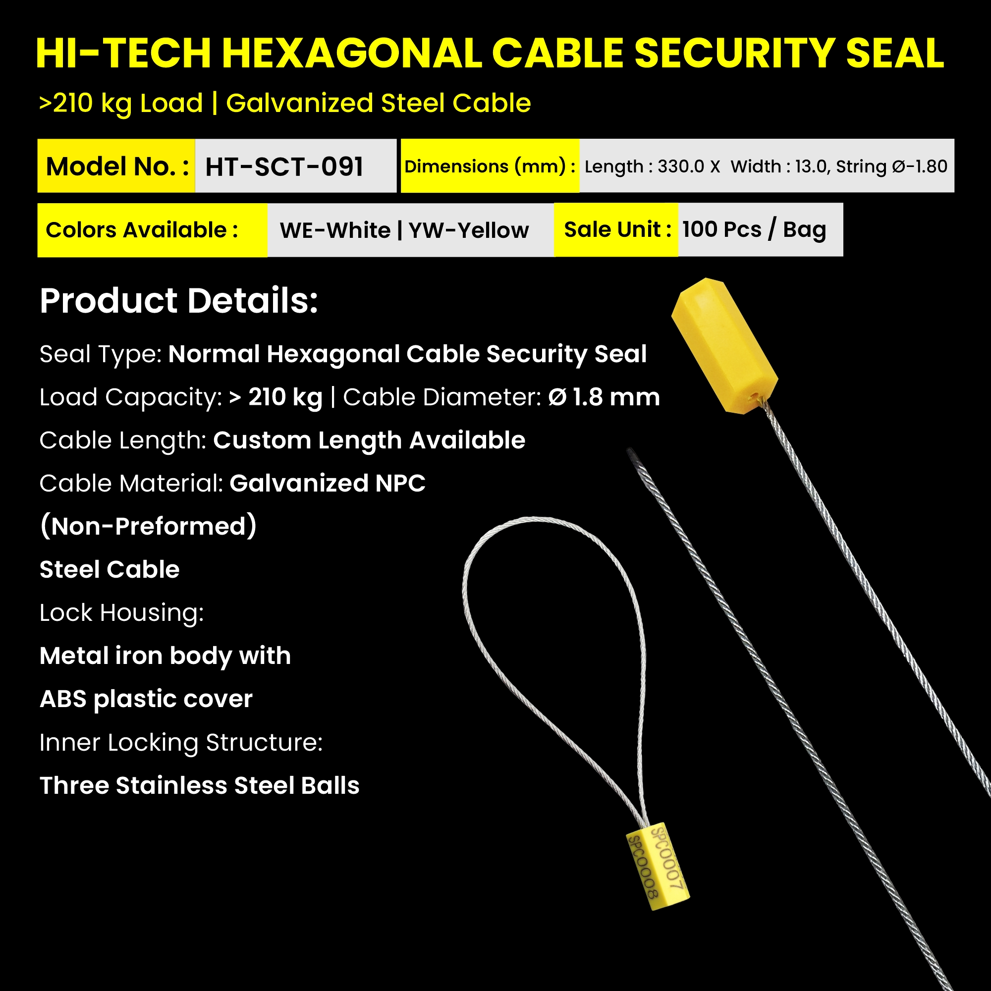 HI-TECH Security Seal HI-TECH Security Seal -HT-SCT-091 is a robust hexagonal cable seal, which ensures the safeness of things and displays whether it was broken. It is designed to resist in hard logistics and industrial applications, and can support a weight of over 210kg before it fails.