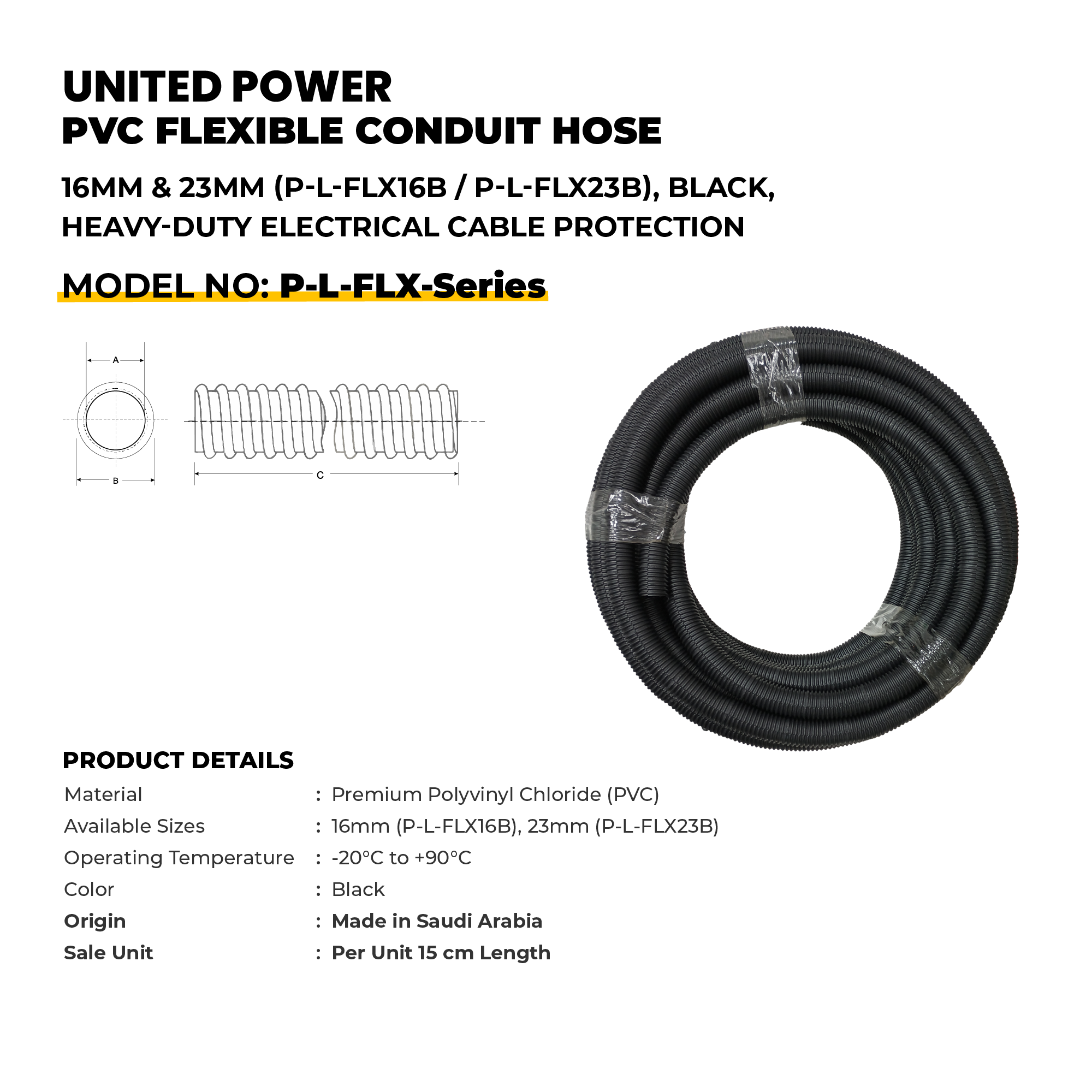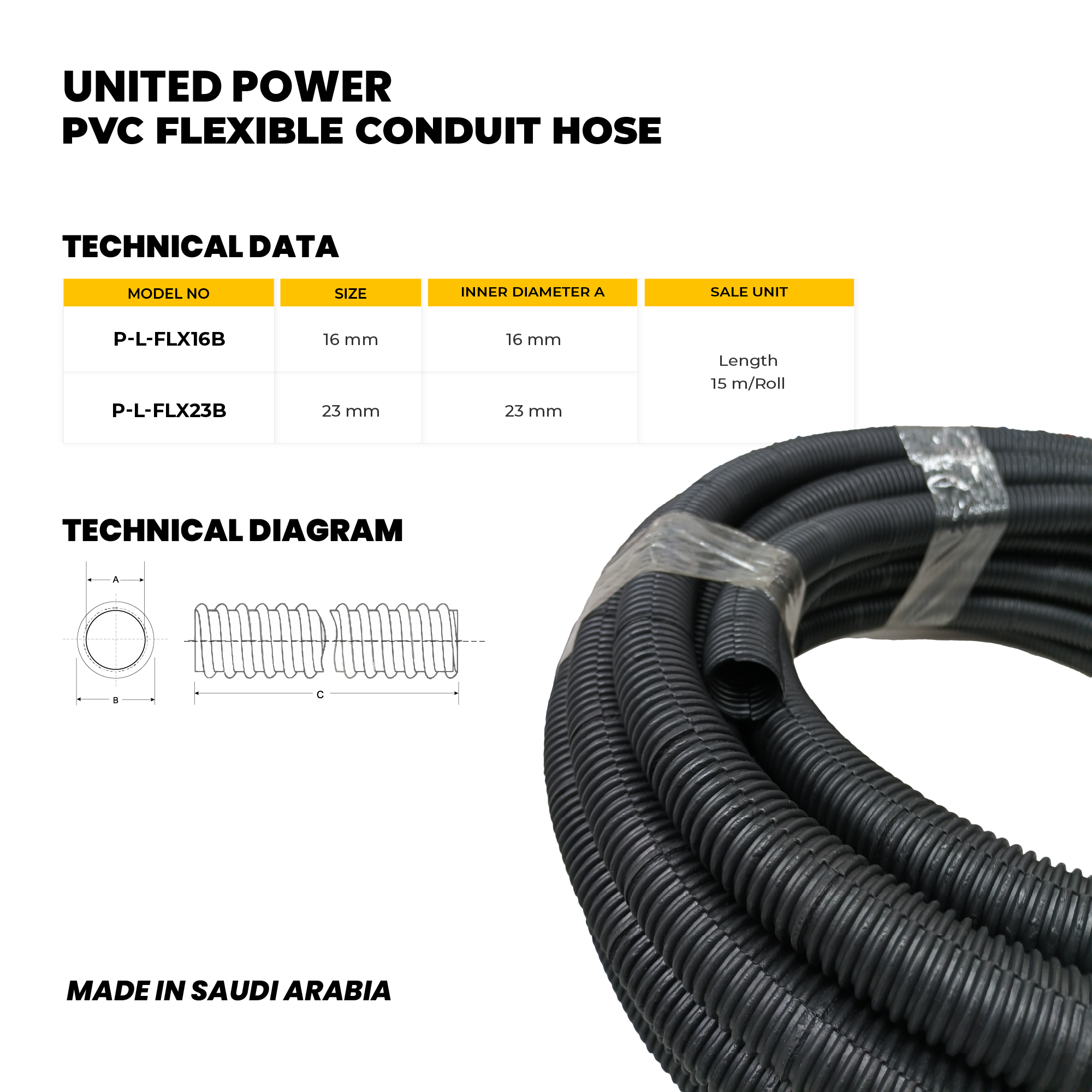 Secure your electric wires with the United Power PVC Flexible Conduit Hose, which is made and produced in Saudi Arabia with high flexibility and strength. They come in 16mm (P-L-FLX16B) and 23mm (P-L-FLX23B) diameters and are designed to protect cables in machinery, construction, automobile and industrial use. These conduits are made of polyvinyl chloride (PVC) with high springiness, high dielectric qualities, and easy installation. United Power flexible conduits can be used in both commercial and residential projects because they offer easy flexibility, vibration, and environmental protection properties.