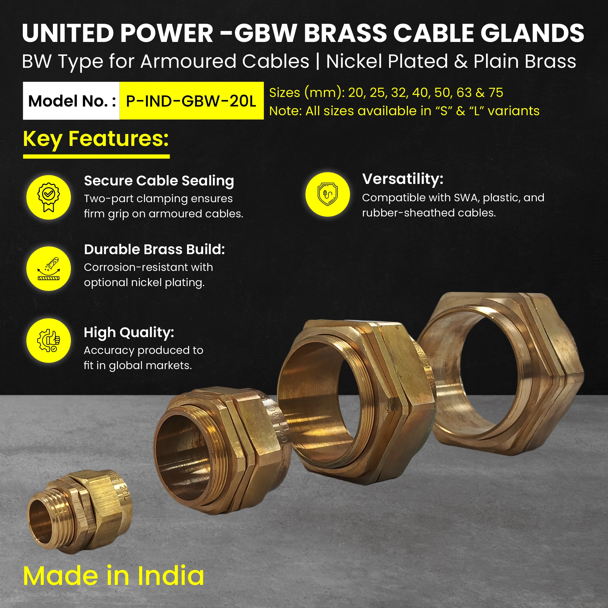 The UNITED POWER GBW Brass Cable Glands have been specifically made to fit the steel wire armored (SWA) cables, offering safe and stable cable terminations. These glands are manufactured of fine brass and supplied in plain brass or nickel-plated, and comply with the BS 6121 Part 1:1989 requirements.