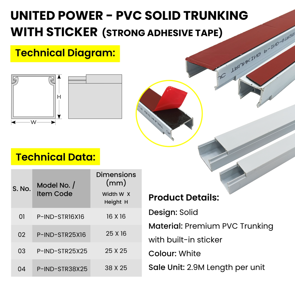 UNITED POWER PVC Trunking with Sticker is a high-end cable management system meant to organize, shield, and efficiently label electrical wiring. The sticker feature enables one to identify circuits or cable types easily, and hence installation and maintenance are also easier and safer. These trunkings are designed using high-quality PVC that is durable, fire-resistant and has a clean white finish that can be used in residential, commercial and industrial setups.