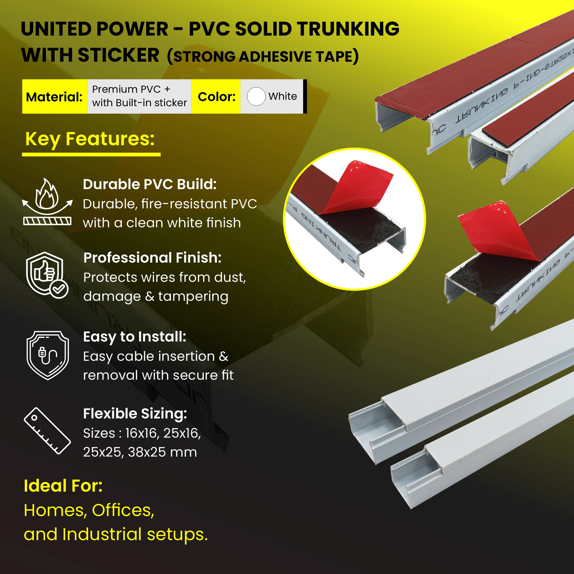 UNITED POWER PVC Trunking with Sticker is a high-end cable management system meant to organize, shield, and efficiently label electrical wiring. The sticker feature enables one to identify circuits or cable types easily, and hence installation and maintenance are also easier and safer. These trunkings are designed using high-quality PVC that is durable, fire-resistant and has a clean white finish that can be used in residential, commercial and industrial setups.